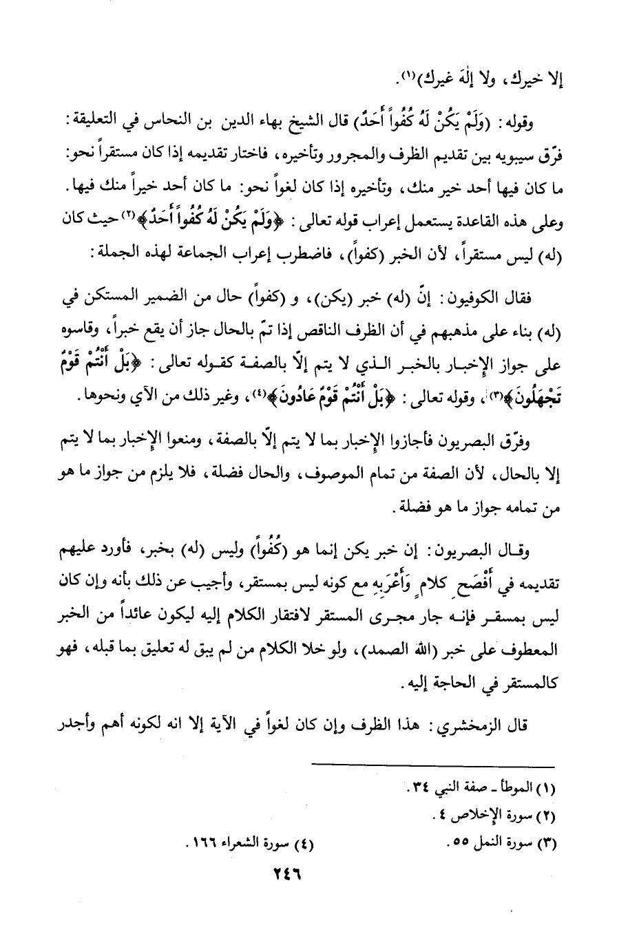 فقال الكوفيون: إنّ (له) خبر (يكن)، و (كفوًا) حال من الضمير المستكن في (له) بناء على مذهبهم في أن الظرف الناقص إذا تمّ بالحال جاز أن يقع خبرًا، وقاسوه على جواز الإخبار بالخبر الذي لا يتم إلاّ بالصفة كقوله تعالى: (بل أنتم قوم تجهلون) [النمل: 55]، وقوله تعالى: (بل أنتم قوم عادون) [الشعراء: 166]، وغير ذلك من الآي ونحوها.