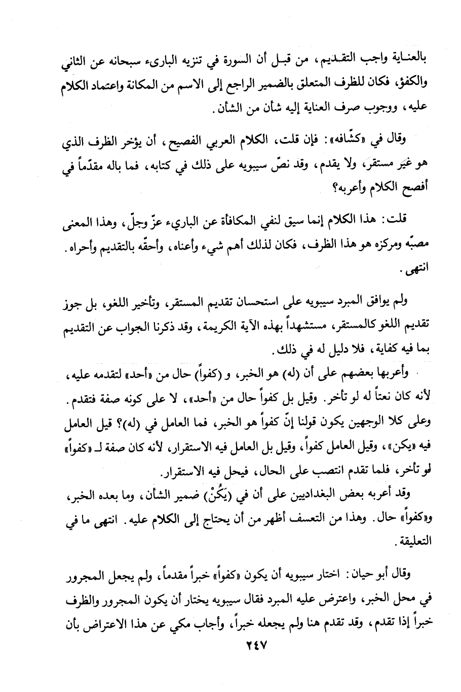 وقال أبو حيان: اختار سيبويه أن يكون "كفوًا" خبرًا مقدمًا، ولم يجعل المجرور في محل الخبر، واعترض عليه المبرد فقال سيبويه يختار أن يكون المجرور والظرف خبرًا إذا تقدم، وقد تقدم هنا ولم يجعله خبرًا، وأجاب مكي عن هذا الاعتراض بأن