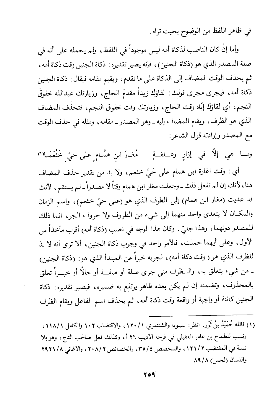 أي: وقت إغارة ابن همام على حيِّ خثعم، ولا بد من تقدير حذف المضاف هنا، لأنك إن لم تفعل ذلك - وجعلت مغار ابن همام وقتًا لا مصدرًا - لم يستقم، لأنك قد عديت (مغار ابن همام) إلى الظرف الذي هو (على حيّ خثعم)، واسم الزمان والمكان لا يتعدى واحد منهما إلى شيء من الظروف ولا حروف الجر، إنما ذلك للمصدر دونهما، وهذا جليّ. وكان هذا الوجه في نصب (ذكاة أمه) أقرب ماخذًا من الأول، وعلى أيهما حملت، فالأمر واحد في وجوب ذكاة الجنين، ألا ترى أنه لا بدّ للظرف الذي هو (وقت ذكاة أمه)، لجريه خبرًا عن المبتدأ الذي هو: (ذكاة الجنين) - من شيء يتعلق به، والظرف متى جرى صلة أو صفة أو حالاً أو خبرًا تعلق بالمحذوف، وتضمنه إن لم يكن بعده ظاهر يرتفع به ضميره، فيصير تقديره: ذكاة الجنين كائنة أو واجبة أو واقعة وقت ذكاة أمه، ثم يحذف اسم الفاعل ويقام الظرف