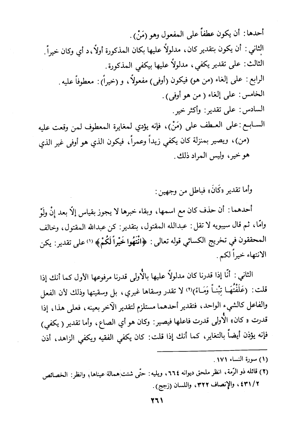 أحدهما: أن حذف كان مع اسمها، وبقاء خبرها لا يجوز بقياس إلاّ بعد إنْ ولو وإمّا، ثم قال سيبويه لا تقل: عبد الله المقتول، بتقدير: كن عبد الله المقتول، وخالف المحققون في تخريج الكسائي قوله تعالى: (انتهوا خيرًا لكم) [النساء: 171] على تقدير: يكن الانتهاء خيرًا لكم.