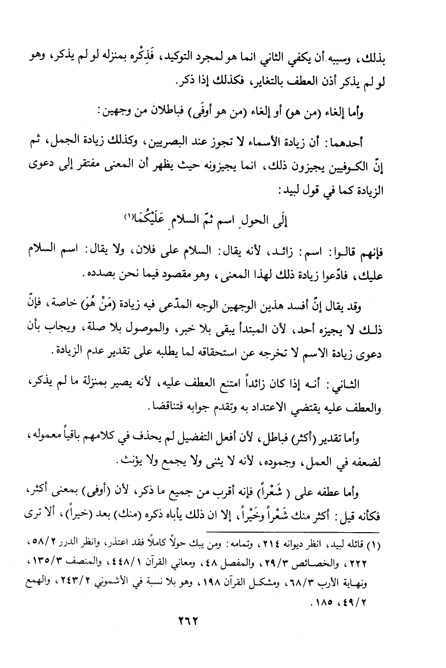 أحدهما: أن زيادة الأسماء لا تجوز عند البصريين، وكذلك زيادة الجمل، ثم إنّ الكوفيين يجيزون ذلك، إنما يجيزونه حيث يظهر أن المعنى مفتقر إلى دعوى الزيادة كما في قول لبيد: