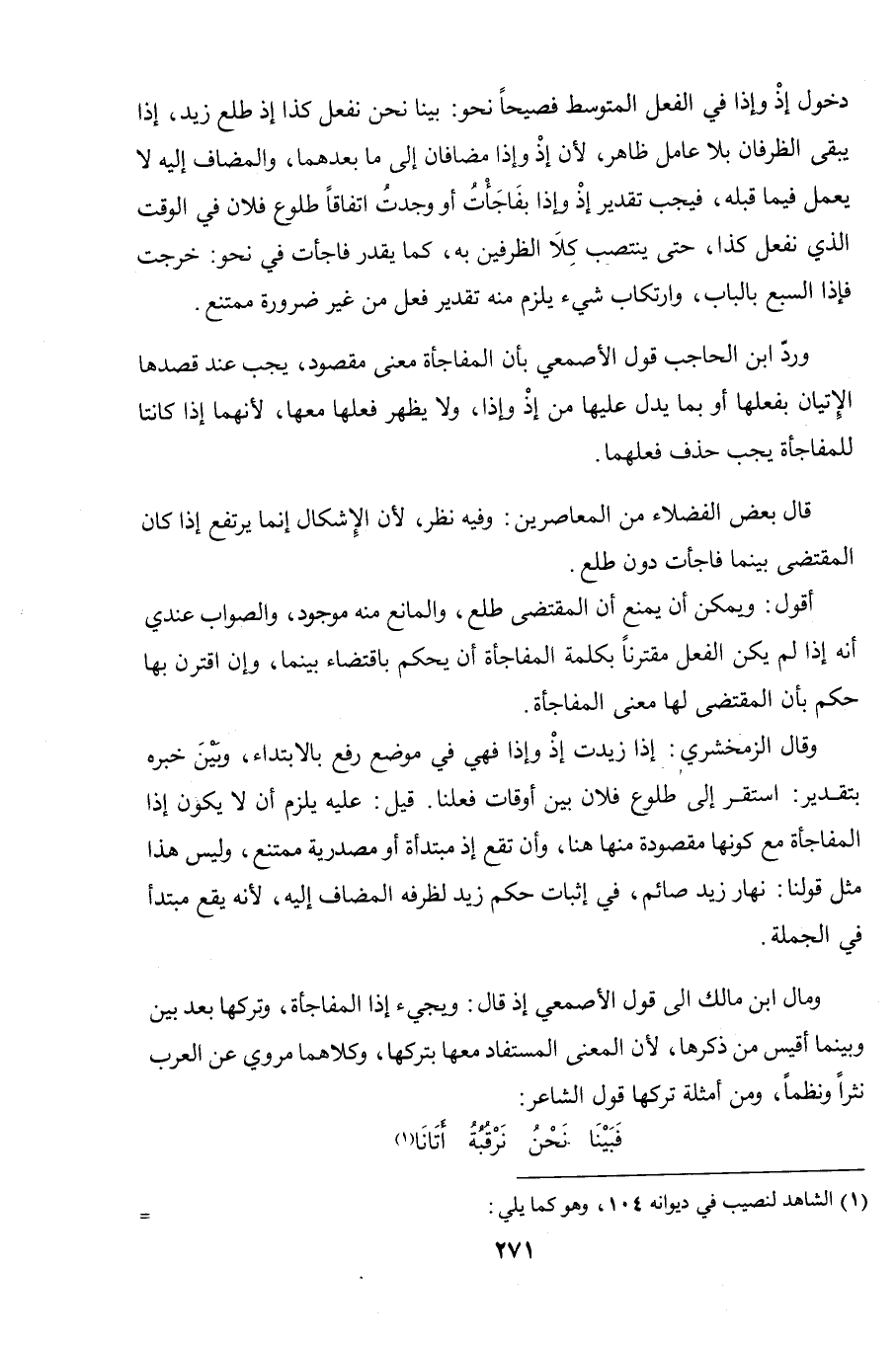 دخول إذْ وإذا في الفعل المتوسط فصيحًا نحو: بينا نحن نفعل كذا إذ طلع زيد، إذا يبقى الظرفان بلا عامل ظاهر، لأن إذْ وإذا مضافان إلى ما بعدهما، والمضاف إليه لا يعمل فيما قبله، فيجب تقدير إذْ وإذا بفاجأتُ أو وجدتُ اتفاقًا طلوع فلان في الوقت الذي نفعل كذا، حتى ينتصب كلا الظرفين به، كما يقدر فاجأت في نحو: خرجت فإذا السبع بالباب، وارتكاب شيء يلزم منه تقدير فعل من غير ضرورة ممتنع.