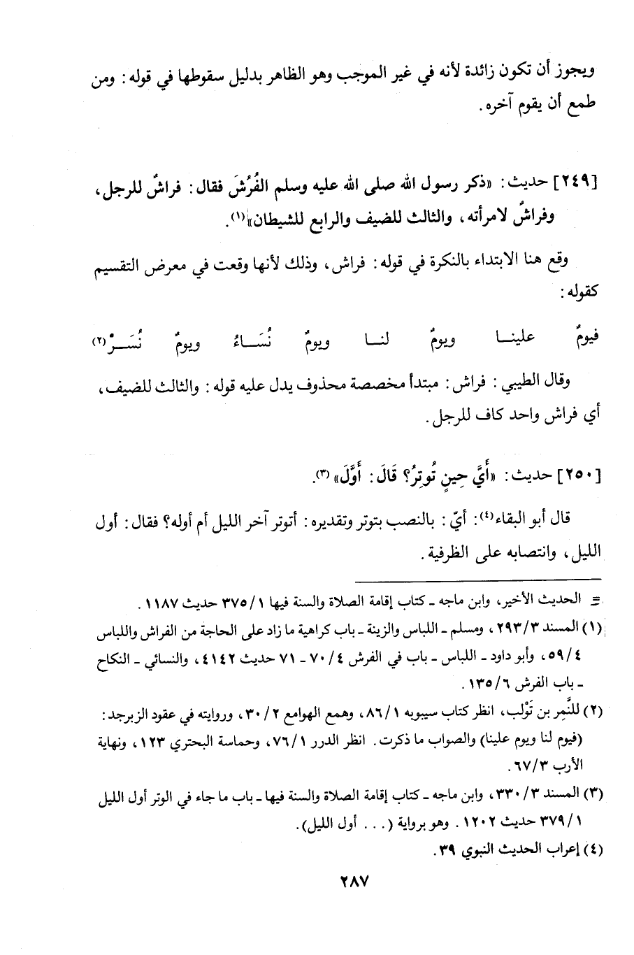 249 - حديث: "ذكر رسول الله صلى الله عليه وسلم الفُرُشَ فقال: فراشٌ للرجل، وفراشٌ لامرأته، والثالث للضيف والرابع للشيطان".