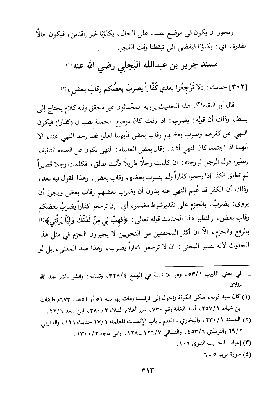 قال أبو البقاء: هذا الحديث يرويه المحدّثون غير محقق وفيه كلام يحتاج إلى بسط، وذلك أن قوله: يضرب: إذا رفعته كان موضع الجملة نصبًا لـ (كفارا) فيكون النهي عن كفرهم وضرب بعضهم رقاب بعض فأيهما فعلوا فقد وجد النهي عنه، إلا أنهما إذا اجتمعا كان النهي أشد. وقال بعض العلماء: النهي يكون عن الصفة الثانية، ونظيره قول الرجل لزوجته: إن كلمت رجلاً طويلاً فأنت طالق، فكلمت رجلاً قصيرًا لم تطلق فكذا إذا رجعوا كفارًا ولم يضرب بعضهم رقاب بعض، وهذا القول فيه بعد، وذلك أن الكفر قد عُلِم النهي عنه بدون أن يضرب بعضهم رقاب بعض ويجوز أن يروى: يضربْ، بالجزم على تقدير شرط مضمر، أي: إن ترجعوا كفارًا يضربْ بعضكم رقاب بعض، والنظير هذا الحديث قوله تعالى: (فهبْ لي من لدنك وليًّا يرثُني) [مريم: 5، 6] بالرفع والجزم، إلاّ أن أكثر المحققين من النحويين لا يجيزون الجزم في مثل هذا الحديث لأنه يصير المعنى: أن لا ترجعوا كفارًا يضرب، وهذا ضد المعنى، بل لو