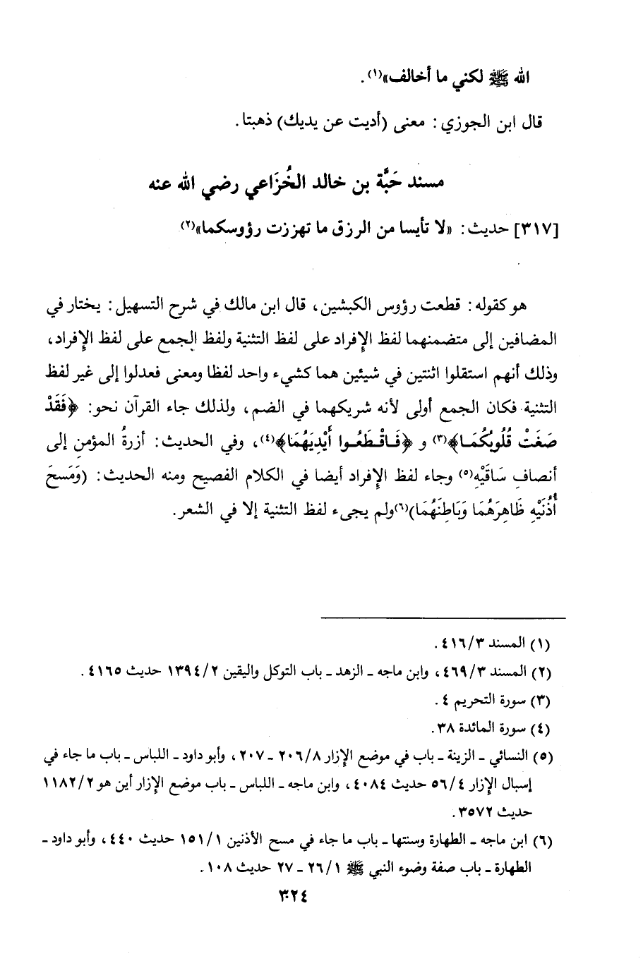 هو كقوله: قطعت رؤوس الكبشين، قال ابن مالك في شرح التسهيل: يختار في المضافين إلى متضمنهما لفظ الإفراد على لفظ التثنية ولفظ الجمع على لفظ الإفراد، وذلك أنهم استثقلوا اثنتين في شيئين هما كشيء واحد لفظا ومعنى فعدلوا إلى غير لفظ التثنية فكان الجمع أولى لأنه شريكهما في الضم، ولذلك جاء القرآن نحو: (فقد صغت قلوبكما) [التحريم: 4] و (فاقطعوا أيديهما) [المائدة: 38]، وفي الحديث: أزرةُ المؤمن إلى أنصاف ساقيه، وجاء لفظ الإفراد أيضًا في الكلام الفصيح ومنه الحديث: (ومسح أذنيه ظاهرهما وباطنَهما) ولم يجئ لفظ التثنية إلا في الشعر.