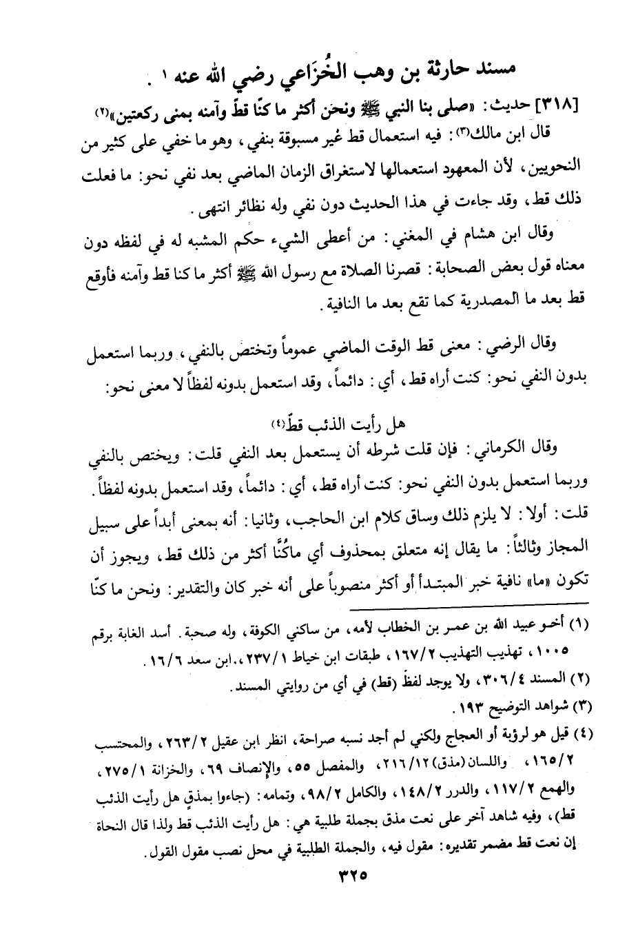 وقال ابن هشام في المغني: من أعطى الشيء حكم المشبه له في لفظه دون معناه قول بعض الصحابة: قصرنا الصلاة مع رسول الله صلى الله عليه وسلم أكثر ما كنا قط وآمنه فأوقع قط بعد ما المصدرية كما تقع بعد ما النافية.