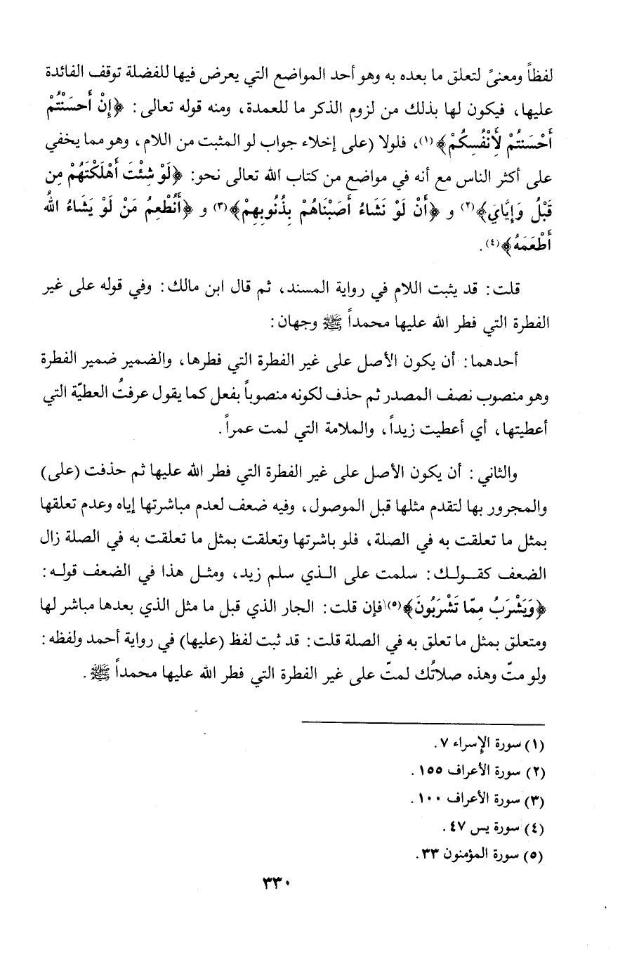 والثاني: أن يكون الأصل على غير الفطرة التي فطر الله عليها ثم حذفت (على) والمجرور بها لتقدم مثلها قبل الموصول، وفيه ضعف لعدم مباشرتها إياه وعدم تعلقها بمثل ما تعلقت به في الصلة، فلو باشرتها وتعلقت بمثل ما تعلقت به في الصلة زال الضعف كقولك: سلمت على الذي سلم زيد، ومثل هذا في الضعف قوله: (ويشرب مما تشربون) [المؤمنون: 33] فإن قلت: الجار الذي قبل ما مثل الذي بعدها مباشر لها ومتعلق بمثل ما تعلق به في الصلة قلت: قد ثبت لفظ (عليها) في رواية أحمد ولفظه: ولو متّ وهذه صلاتُك لمتّ على غير الفطرة التي فطر الله عليها محمدًا صلى الله عليه وسلم.