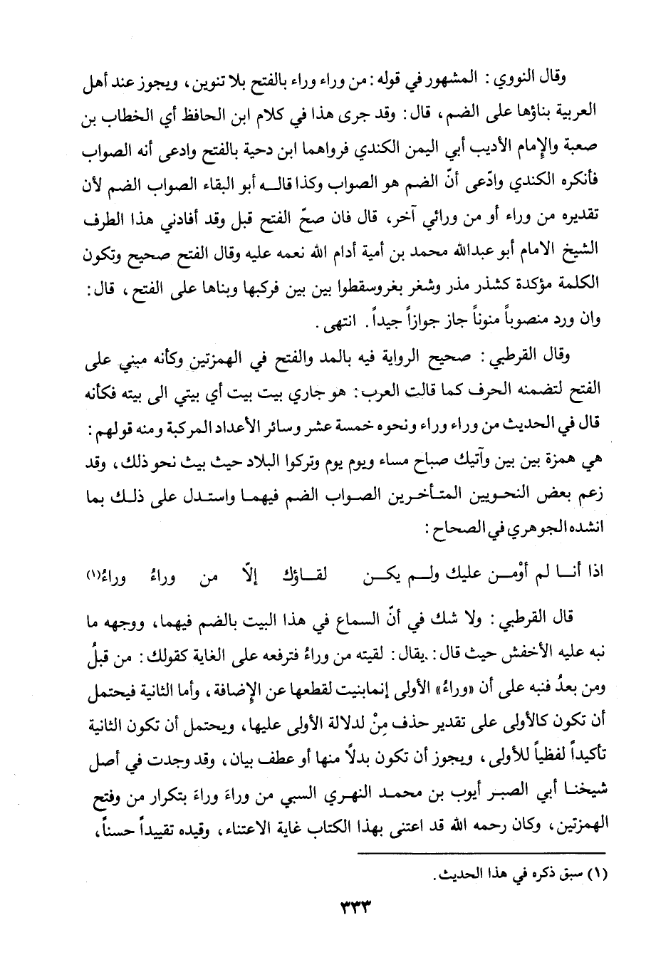 قال القرطبي: ولا شك في أنّ السماع في هذا البيت بالضم فيهما، ووجهه ما نبه عليه الأخفش حيث قال: يقال: لقيته من وراءُ فترفعه على الغاية كقولك: من قبلُ ومن بعدُ فنبه على أن "وراءُ" الأولى إنما بنيت لقطعها عن الإضافة، وأما الثانية فيحتمل أن تكون كالأولى على تقدير حذف مِنْ لدلالة الأولى عليها، ويحتمل أن تكون الثانية تأكيدًا لفظيًا للأولى، ويجوز أن تكون بدلاً منها أو عطف بيان، وقد وجدت في أصل شيخنا أبي الصبر أيوب بن محمد النهري السبي من وراءَ وراءَ بتكرار من وفتح الهمزتين، وكان رحمه الله قد اعتنى بهذا الكتاب غاية الاعتناء، وقيده تقييدًا حسنًا،