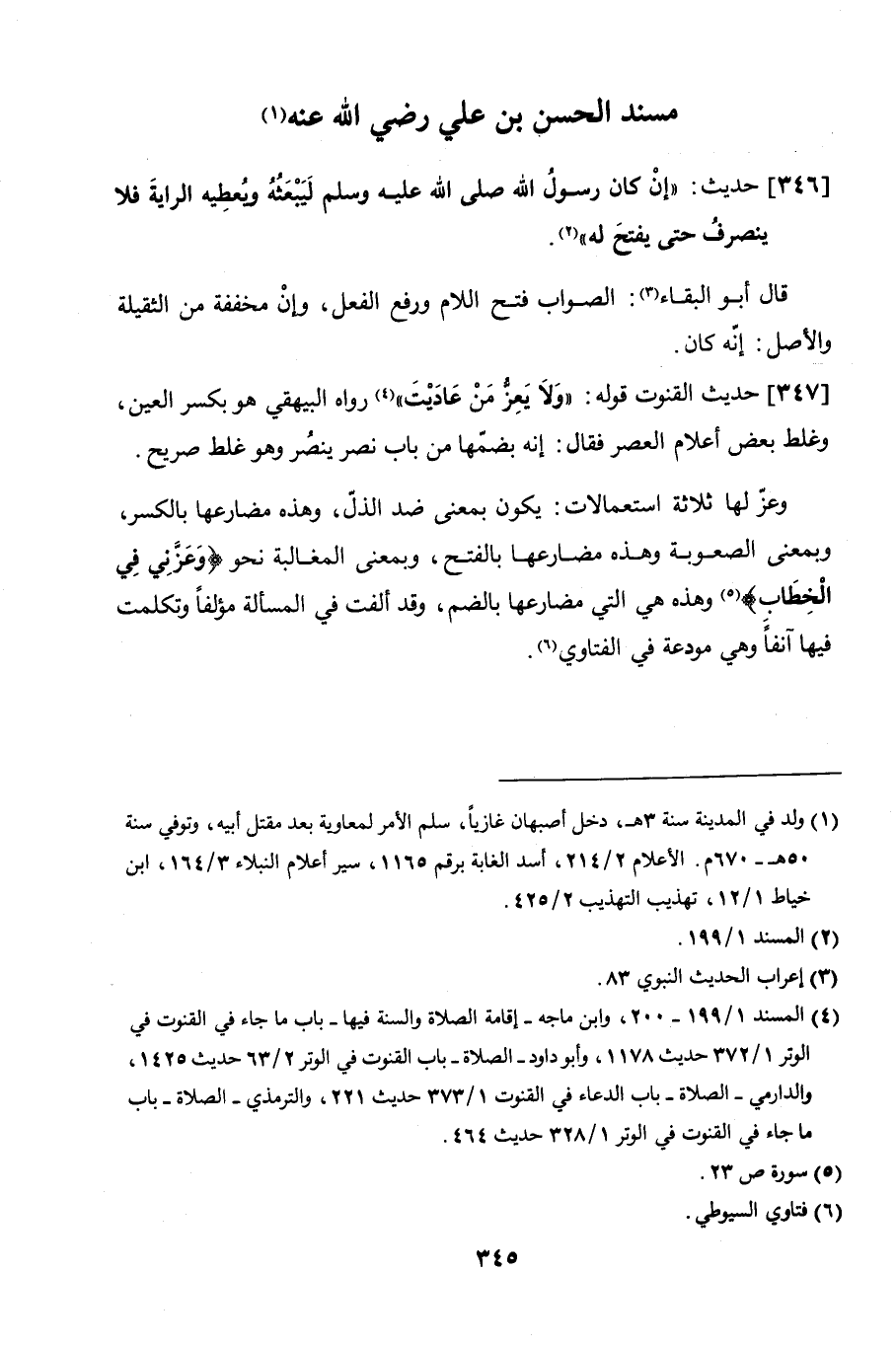 347 - حديث القنوت قوله: "ولا يَعِزُّ من عاديت" رواه البيهقي هو بكسر العين، وغلط بعض أعلام العصر فقال: إنه بضمّها من باب نصر ينصُر وهو غلط صريح.