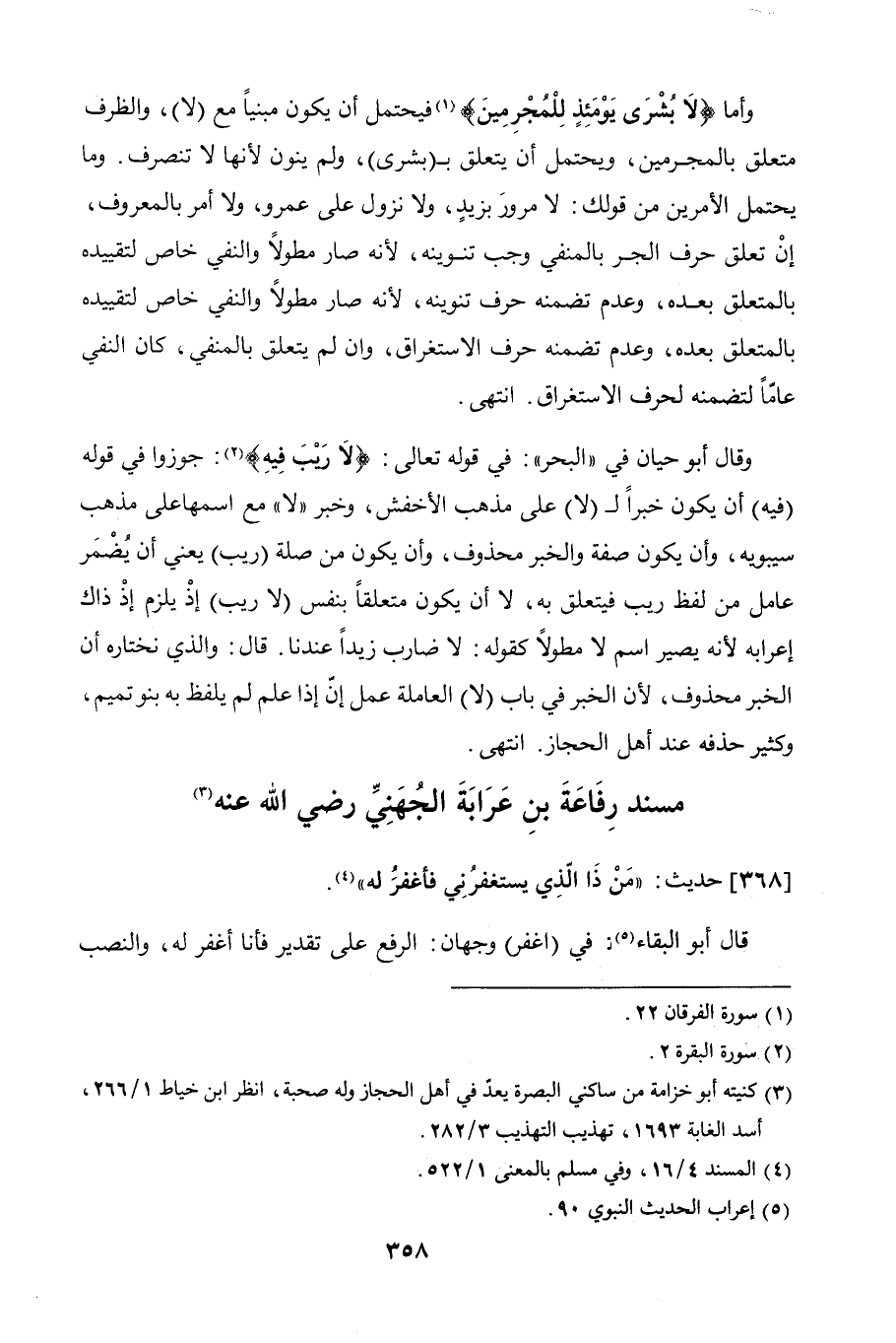 وأما (لا بشرى يومئذ للمجرمين) [الفرقان: 22] فيحتمل أن يكون مبنيًا مع (لا)، والظرف متعلق بالمجرمين، ويحتمل أن يتعلق بـ (بشرى)، ولم ينون لأنها لا تنصرف. وما يحتمل الأمرين من قولك: لا مرورَ بزيد، ولا نزول على عمرو، ولا أمر بالمعروف، إنْ تعلق حرف الجر بالمنفي وجب تنوينه، لأنه صار مطولاً والنفي خاص لتقييده بالمتعلق بعده، وعدم تضمنه حرف تنوينه، لأن صار مطولاً والنفي خاص لتقييده بالمتعلق بعده، وعدم تضمنه حرف الاستغراق، وإن لم يتعلق بالمنفي، كان النفي عامًّا لتضمنه حرف الاستغراق. انتهى.