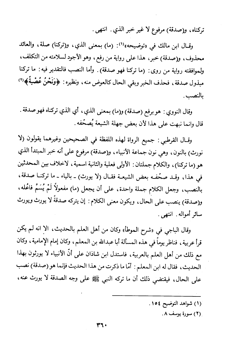 وقال القرطبي: جميع الرواة لهذه اللفظة في الصحيحين وغيرهما يقولون (لا نورث) بالنون، وهي نون جماعة الأنبياء، و (صدقة) مرفوع على أنه خبر المبتدأ الذي هو (ما تركنا)، والكلام جملتان: الأولى فعلية والثانية اسمية، لا خلاف بين المحدثين في هذا، وقد صحّفه بعض الشيعة فقال (لا يورث) -بالياء-، ما تركنا صدقة، بالنصب، وجعل الكلام جملة واحدة، على أن يجعل (ما) مفعولاً لم يسم فاعله، و (صدقة) ينصب على الحال، ويكون معنى الكلام: إن يتركه صدقةً لا يورث ويورث سائر أمواله. انتهى.