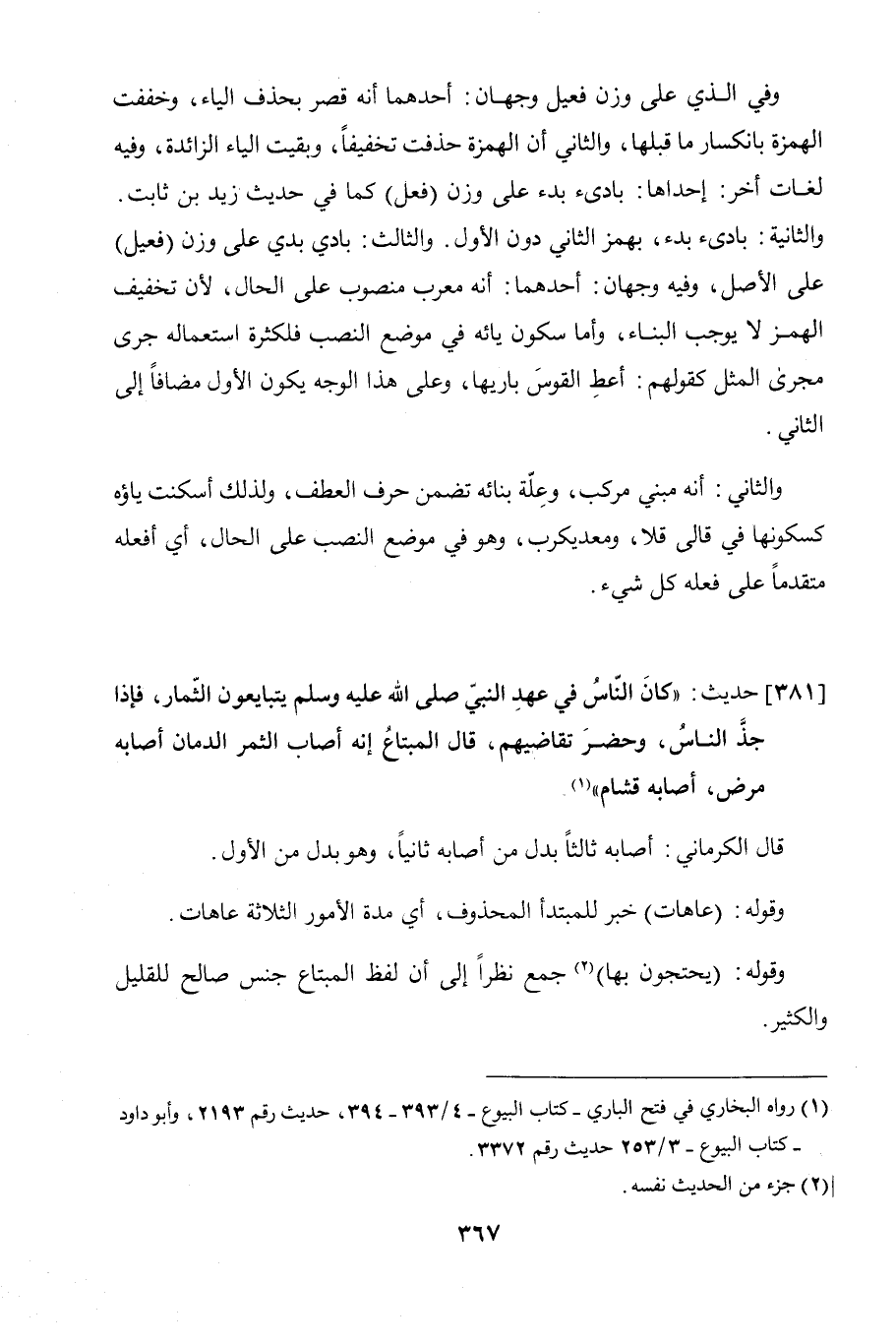 وفي الذي على وزن فعيل وجهان: أحدهما أنه قصر بحذف الياء، وخففت الهمزة بانكسار ما قبلها، والثاني أن الهمزة حذفت تخفيفًا، وبقيت الياء الزائدة، وفيه لغات أخر: إحداها: بادئ بدء على وزن (فعل) كما في حديث زيد بن ثابت. والثانية: بادئ بدء، بهمز الثاني دون الأول. والثالث: بادي بدي على وزن (فعيل) على الأصل، وفيه وجهان: أحدهما: أنه معرب منصوب على الحال، لأن تخفيف الهمز لا يوجب البناء، وأما سكون يائه في موضع النصب فلكثرة استعماله جرى مجرى المثل كقولهم: أعطِ القوسَ باريها، وعلى هذا الوجه يكون الأول مضافًا إلى الثاني.