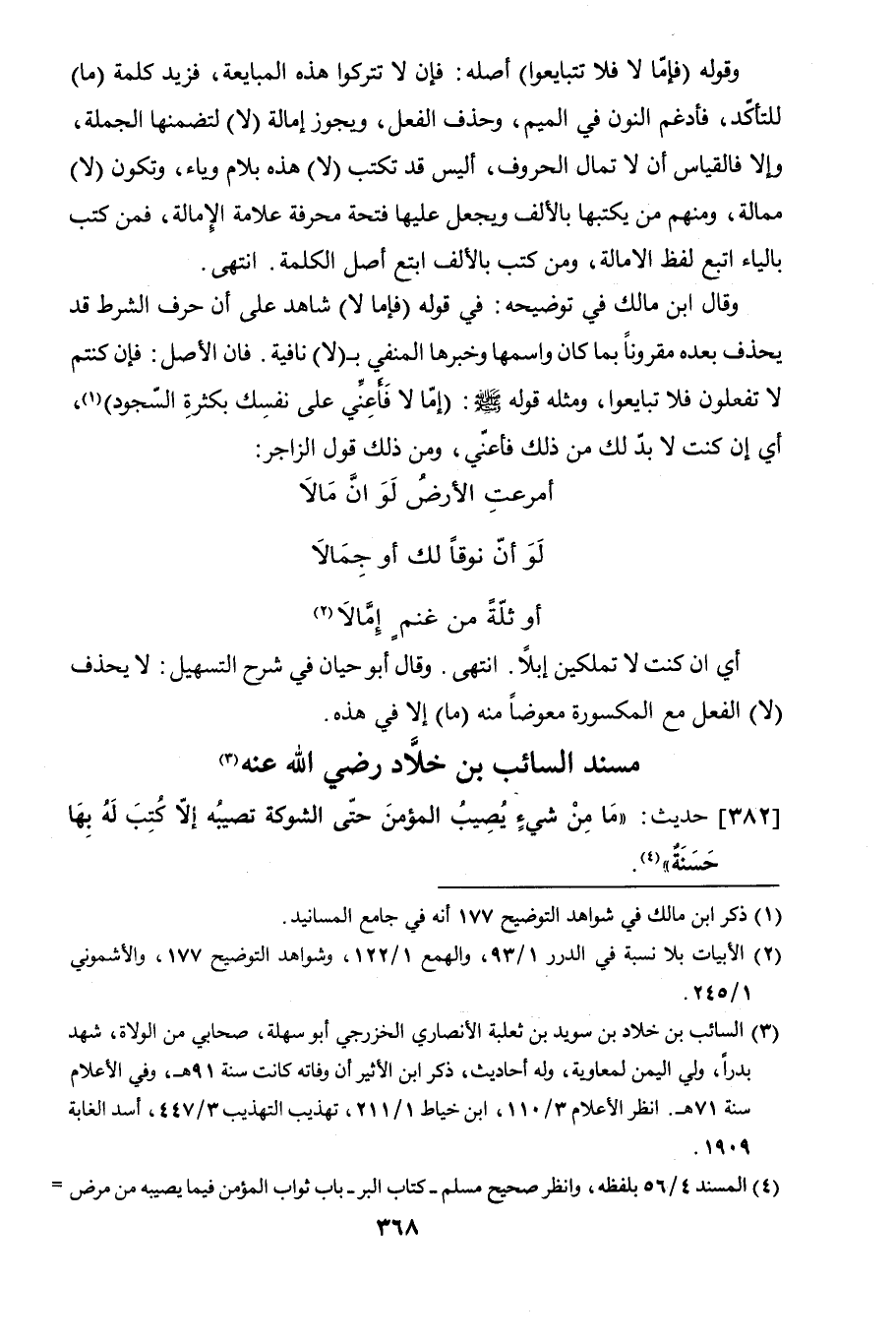 وقال ابن مالك في توضيحه: في قوله (فإما لا) شاهد على أن حرف الشرط قد يحذف بعده مقرونًا بما كان واسمها وخبرها المنفي بـ (لا) نافية. فإن الأصل: فإن كنتم لا تفعلون فلا تبايعوا، ومثله قوله صلى الله عليه وسلم: (إمّا لا فأعِنّي على نفسك بكثرة السجود)، أي إن كنت لا بدّ لك من ذلك فأعني، ومن ذلك قول الزاجر: