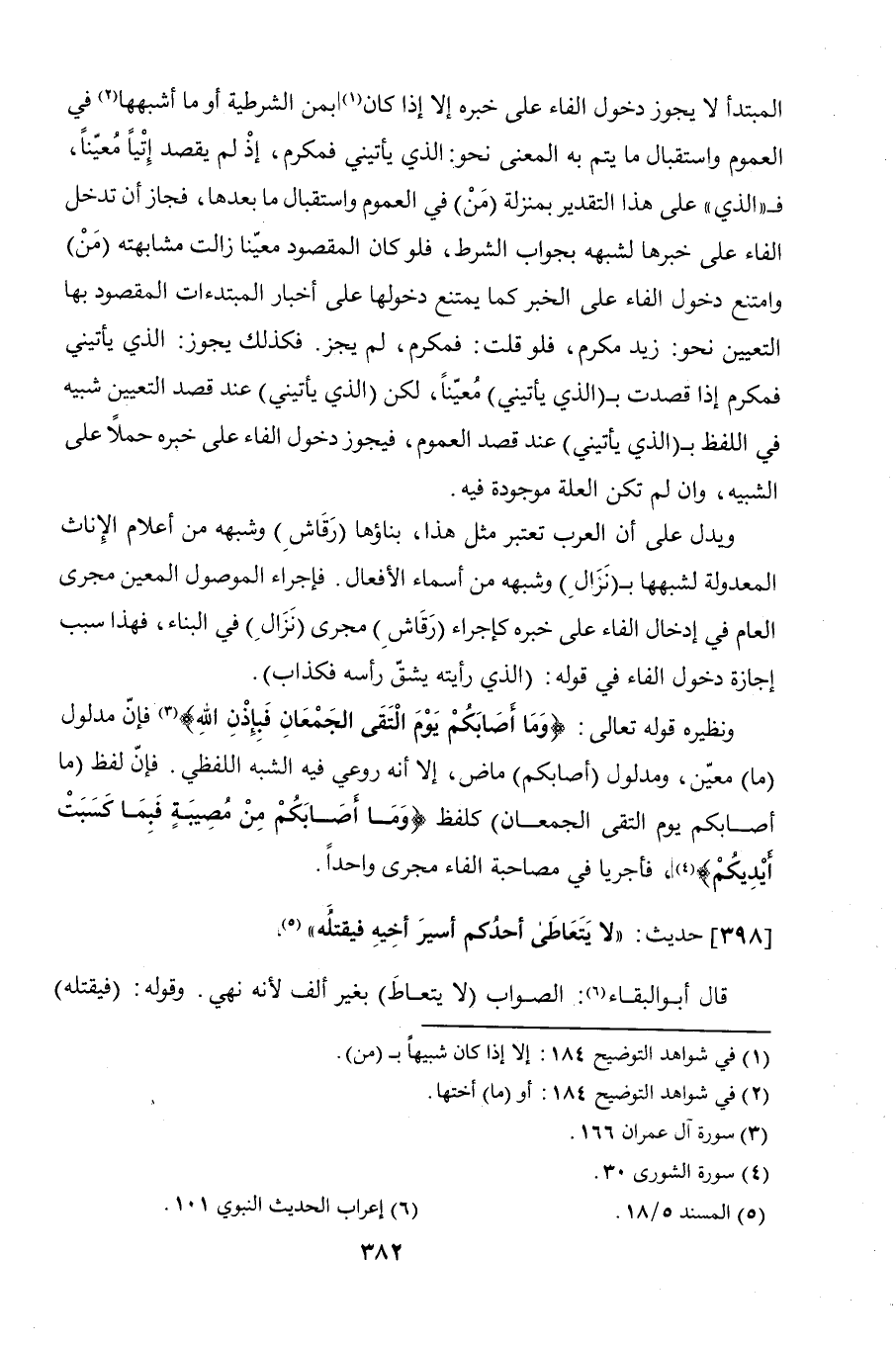 المبتدأ لا يجوز دخول الفاء على خبره إلا إذا كان بمن الشرطية أو ما أشبهها في العموم واستقبال ما يتم به المعنى نحو: الذي يأتيني فمكرم، إذ لم يقصد إتْيًا مُعيّنًا، فـ "الذي" على هذا التقدير بمنزلة (مَنْ) في العموم واستقبال ما بعدها، فجاز أن تدخل الفاء على خبرها لشبهه بجواب الشرط، فلو كان المقصود معيّنا زالت مشابهته (مَنْ) وامتنع دخول الفاء على الخبر كما يمتنع دخولها على أخبار المبتدءات المقصود بها التعيين نحو: زيد مكرم، فلو قلت: فمكرم، لم يجز. فكذلك يجوز: الذي يأتيني فمكرم إذا قصدت بـ (الذي يأتيني) معيّنًا، لكن (الذي يأتيني) عند قصد التعيين شبيه في اللفظ بـ (الذي يأتيني) عند قصد العموم، فيجوز دخول الفاء على خبره حملاً على الشبيه، وإن لم تكن العلة موجودة فيه.