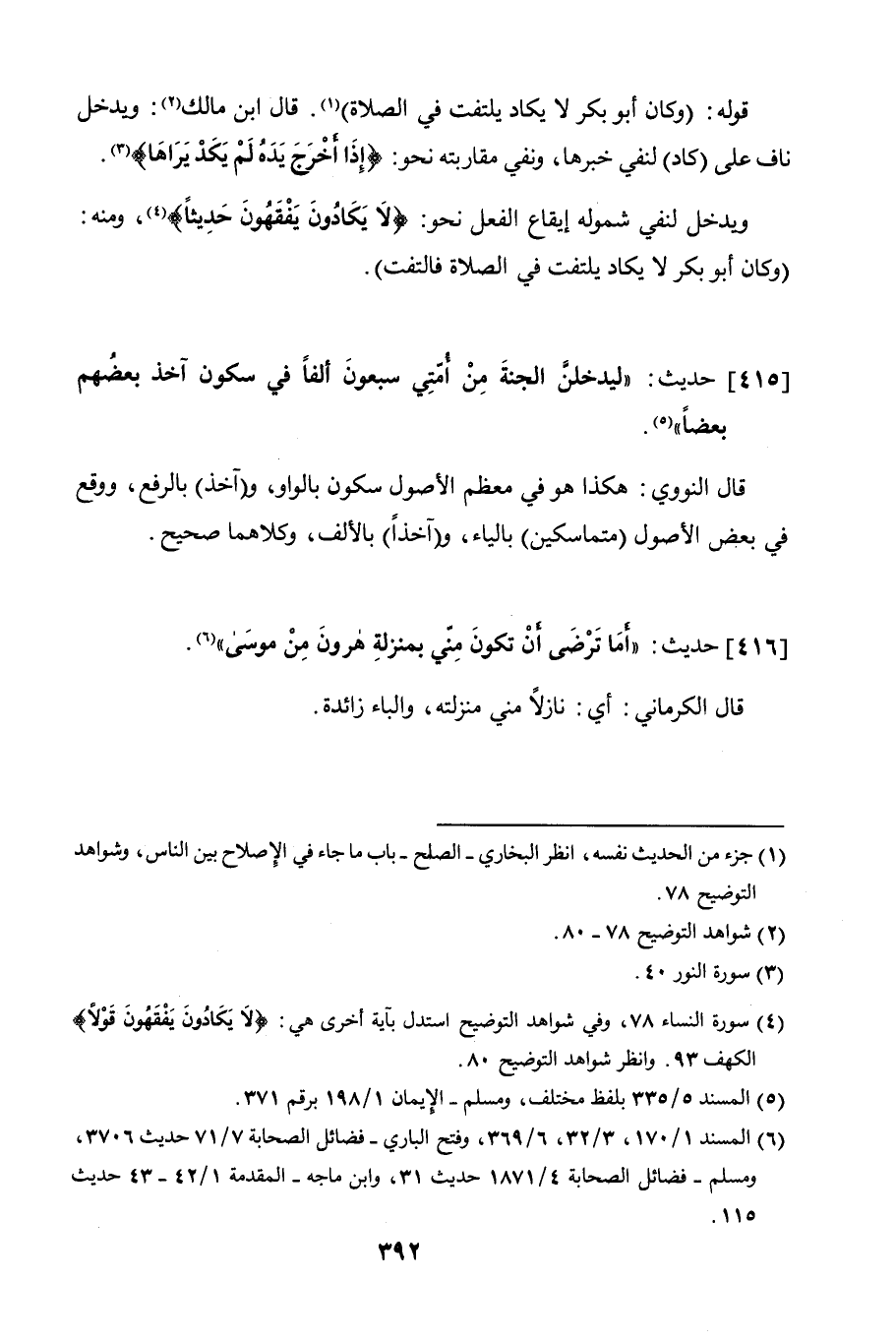 قوله: (وكان أبو بكر لا يكاد يلتفت في الصلاة). قال ابن مالك: ويدخل ناف على (كاد) لنفي خبرها، ونفي مقاربته نحو: (إذا أخرج يده لم يكد يراها) [النور: 40].