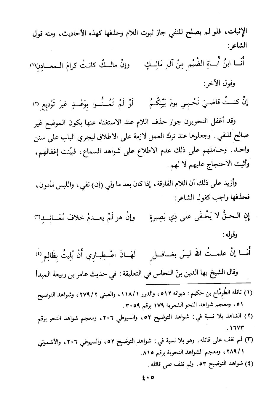 وقد أغفل النحويون جواز حذف اللام عند الاستغناء عنها بكون الموضع غير صالح للنفي. وجعلوها عند ترك العمل لازمة على الإطلاق ليجري الباب على سنن واحد. وحاملهم على ذلك عدم الاطلاع على شواهد السماع، فبيّنت إغفالهم، وأثبت الاحتجاج عليهم لا لهم.