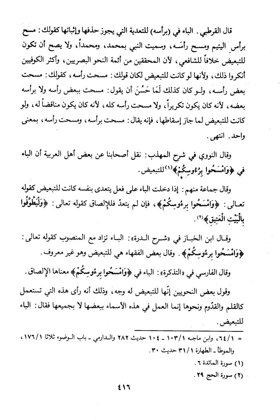 قال القرطبي: الباء في (برأسه) للتعدية التي يجوز حذفها وإثباتها كقولك: مسح برأس اليتيم ومسح رأسَه، وسميت النبي بمحمد، ومحمدًا، ولا يصح أن تكون للتبعيض خلافًا للشافعي، لأن المحققين من أئمة النحو البصريين، وأكثر الكوفيين أنكروا ذلك، ولأنها لو كانت للتبعيض لكان قولك: مسحت رأسه، كقولك: مسحت بعض رأسه، ولو كان كذلك لما حسُنَ أن يقول: مسحت ببعض رأسه ولا برأسه بعضه، لأنه كان يكون تكريرًا، ولا مسحت رأسه كله، لأنه كان يكون مناقضًا له، ولو كانت للتبعيض لما جاز إسقاطها، فإنه يقال: مسحت برأسه، ومسحت رأسه، بمعنى واحد. انتهى.