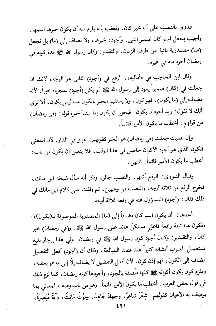 وقال ابن الحاجب في "أماليه": الرفع في (أجود) الثاني هو الوجه، لأنك إن جعلت في (كان) ضميرًا يعود إلى رسول الله صلى الله عليه وسلم لم يكن (أجود) بمجرده خبرًا، لأنه مضاف إلى (ما يكون)، فهو كون، ولا يستقيم الخبر بالكون عما ليس بكون، ألا ترى أنك لا تقول: زيد أجود ما يكون. فيجوز أن يكون إما مبتدأ خبره قوله: (في رمضان) من قولهم: أخطب ما يكون الأمير قائمًا.