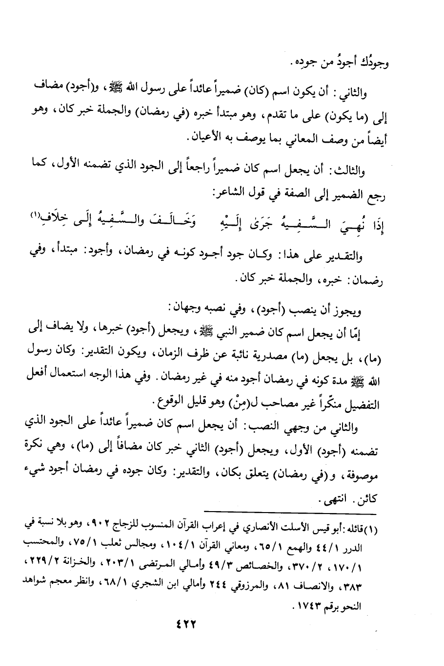 والثالث: أن يجعل اسم كان ضميرًا راجعًا إلى الجود الذي تضمنه الأول، كما رجع الضمير إلى الصفة في قول الشاعر: