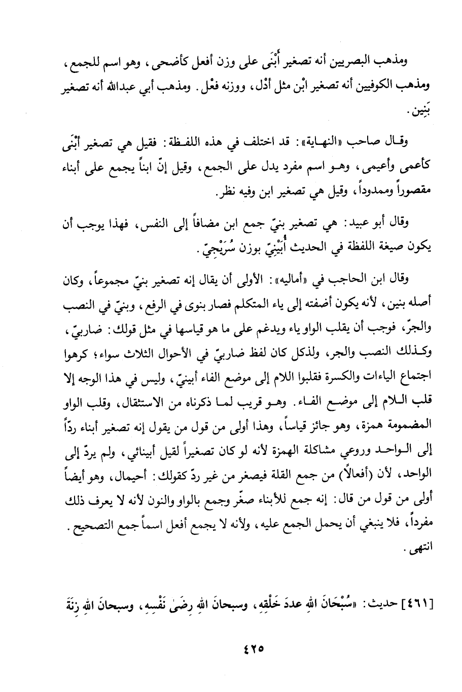 ومذهب البصريين أنه تصغير أبْنى على وزن أفْعل كأضحى، وهو اسم للجمع، مذهب الكوفيين أنه تصغير ابن مثل أدْل، ووزنه فعْل. ومذهب أبي عبد الله أنه تصغير بنين.