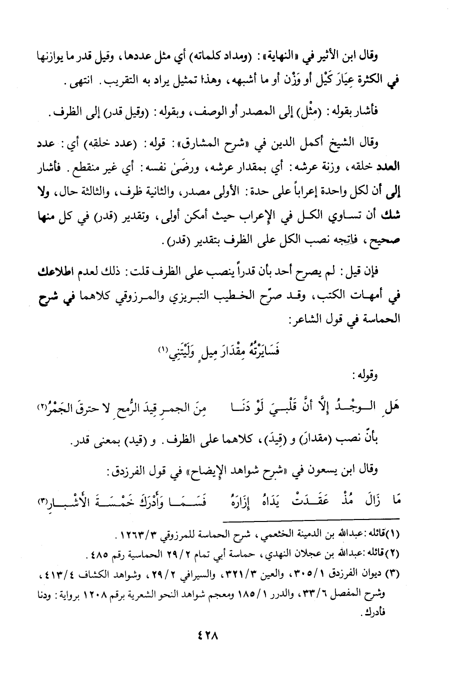 فإن قيل: لم يصرح أحد بأن قدرًا ينصب على الظرف قلت: ذلك لعدم اطلاعك في أمهات الكتب، وقد صرّح الخطيب التبريزي والمرزوقي كلاهما في شرح الحماسة في قول الشاعر: