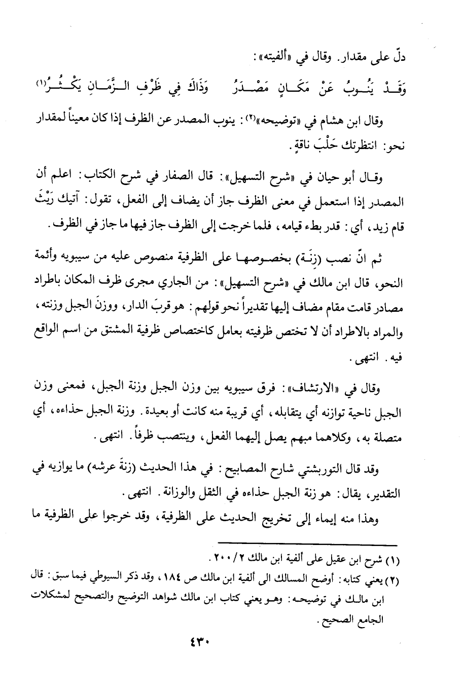 ثم إنّ نصب (زنة) بخصوصها على الظرفية منصوص عليه من سيبويه وأئمة النحو، قال ابن مالك في "شرح التسهيل": من الجاري مجرى ظرف المكان باطراد مصادر قامت مقام مضاف إليها تقديرًا نحو قولهم: هو قربَ الدار، ووزنَ الجبل وزنته، والمراد بالاطراد أن لا تختص ظرفيته بعامل كاختصاص ظرفية المشتق من اسم الواقع فيه. انتهى.