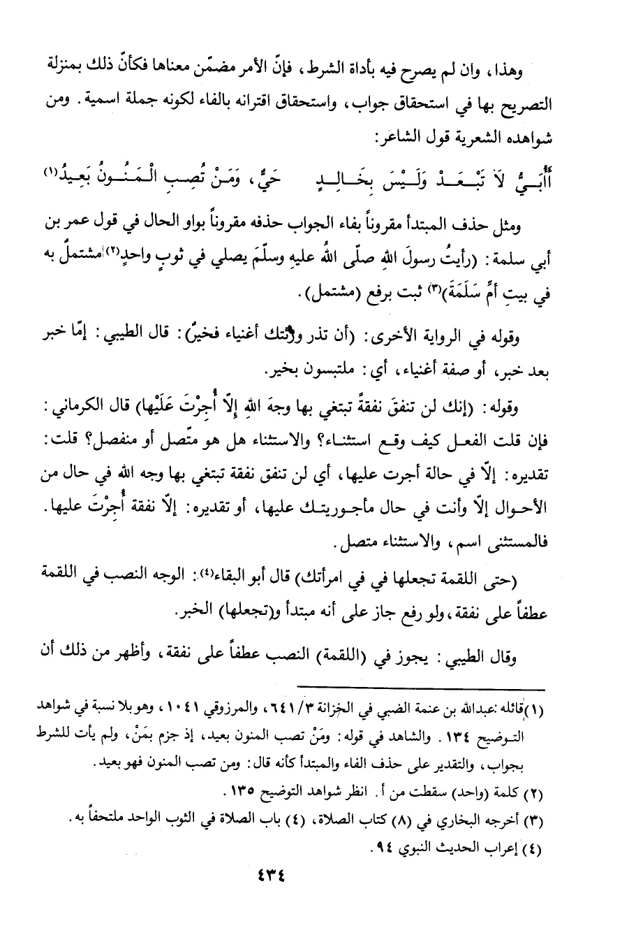 وقوله: (إنك لن تنفق نفقةً تبتغي بها وجه الله إلاّ أجرت عليها) قال الكرماني: فإن قلت الفعل كيف وقع استثناء؟ والاستثناء هل هو متصل أو منفصل؟ قلت: تقديره: إلاّ في حالة أجرت عليها، أي لن تنفق نفقة تبتغي بها وجه الله في حال من الأحوال إلاّ وأنت في حال مأجوريتك عليها، أو تقديره: إلاّ نفقة أُجِرْت عليها. فالمستثنى اسم، والاستثناء متصل.