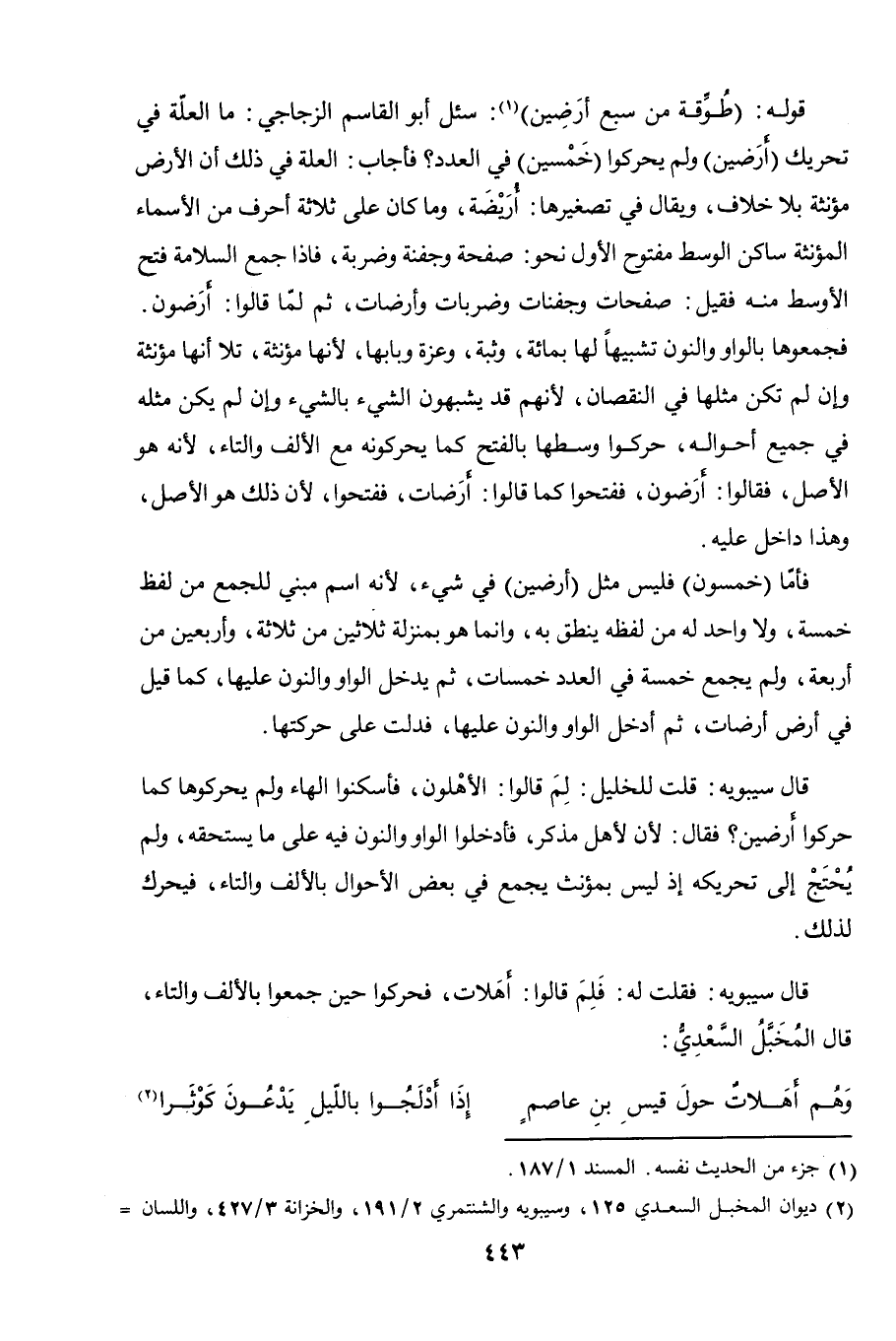قال سيبويه: قلت للخليل: لم قالوا: الأهْلون، فأسكنوا الهاء ولم يحركوها كما حركوا أرضين؟ فقال: لأن الأهل مذكر، فأدخلوا الواو والنون فيه على ما يستحقه، ولم يحتج إلى تحريكه إذ ليس بمؤنث يجمع في بعض الأحوال بالألف والتاء، فيحرك لذلك.