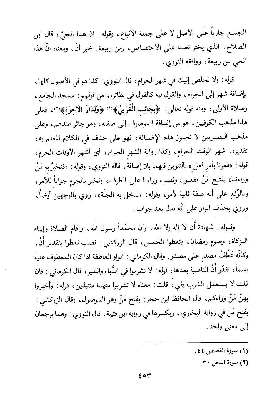 قوله: ولا نخلص إليك في شهر الحرام، قال النووي: كذا هو في الأصول كلها، بإضافة شهر إلى الحرام، والقول فيه كالقول في نظائره، من قولهم: مسجد الجامع، وصلاة الأولى، ومنه قوله تعالى: (بجانب الغربي) [القصص: 44] (ولدار الآخرة) [النحل: 30]، فعلى هذا مذهب الكوفيين، هو من إضافة الموصوف إلى صفته، وهو جائز عندهم، وعلى مذهب البصريين لا تجوز هذه الإضافة، فهو على حذف في الكلام للعلم به، تقديره: شهر الوقت الحرام، وكذا رواية الشهر بالحرام، أي أشهر الأوقات الحرم، قوله: "فمرنا بأمرٍ فعلٍ" بالتنوين فيهما بلا إضافة، قاله النووي، وقوله: "فنخبرْ به من وراءنا" بفتح مَنْ مفعول ونصب وراءنا على الظرف، ونخبر بالجزم جوابًا للأمر، وبالرفع على أنه صفة ثانية لأمر، وقوله: "ندخل به الجنة"، روي بالوجهين أيضًا، وروي بحذف الواو على أنه بدل بعد جواب.