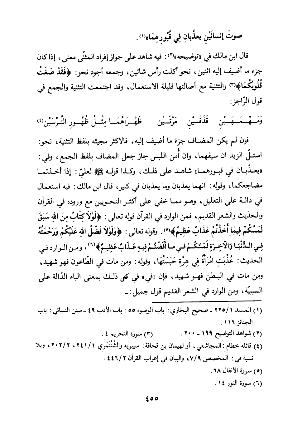 فإن لم يكن المضاف جزء ما أضيف إليه، فالأكثر مجيئه بلفظ التثنية، نحو: استلّ الزيدان سيفهما، وإن أُمِن اللبس جاز جعل المضاف بلفظ الجمع، وفي: "يعذّبان في قبورهما" شاهد على ذلك، وكذا قوله صلى الله عليه وسلم لعليّ: إذا أخذتما مضاجعكما، وقوله: إنهما يعذبان وما يعذبان في كبير، قال ابن مالك: فيه استعمال في دالة على التعليل، وهو مما خفي على أكثر النحويين مع وروده في القرآن والحديث والشعر القديم، فمن الوارد في القرآن قوله تعالى: (لولا كتابٌ من الله سبق لمسكم فيما أخذتم عذاب عظيم) [الأنفال: 68]. وقوله تعالى: (ولولا فضل الله عليكم ورحمته في الدنيا والآخرة لمسكم في ما أفضتم فيه عذاب عظيم) [النور: 14]، ومن الوارد في الحديث: عذبت امرأة في هرة حبستها، وقوله: ومن مات في الطاعون فهو شهيد، ومن مات في البطن فهو شهيد، فإن "في" في كل ذلك بمعنى الباء الدالة على السببية، ومن الوارد في الشعر القديم قول جميل: