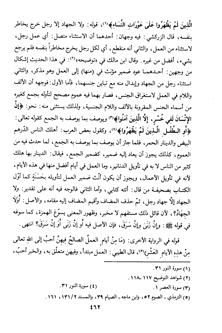 الذين لم يظهروا على عورات النساء) [النور: 31]، قوله: ولا الجهاد إلا رجل خرج يخاطر بنفسه، قال الزركشي: فيه وجهان: أحدهما أن الاستثناء متصل: أي عمل رجل، لاستثناء من العمل، والثاني أنه منقطع، أي لكل رجل يخرج مخاطرًا بنفسه فلم يرجع بشيء أفضل من غيره. وقال ابن مالك في "توضيحه": في هذا الحديث إشكال من وجهين: أحدهما عود ضمير مؤنث في (منها) إلى العمل وهو مذكر، والثاني استثناء رجل من الجهاد وإبدال منه مع تباين جنسيهما، فأما الأول: فوجهه أن الألف واللام في العمل لاستغراق الجنس، فصار بهما فيه عموم مصحح لتأوله بجمع كغيره من أسماء الجنس المقرونة بالألف واللام الجنسية، ولذلك يستثنى منه: نحو: (إن الإنسان لفي خسر، إلا الذين آمنوا) [العصر: 1]، ويوصف بما يوصف به الجمع كقوله تعالى: (أو الطفل الذين لم يظهروا) [النور: 31]، وكقول بعض العرب: أهلك الناس الدرهم البيض والدينار الحمر، فلما جاز أن يوصف بما يوصف به الجمع، لما حدث فيه من العموم، كذلك يجوز أن يعاد إليه ضمير، كضمير الجمع، فيقال: الدينار بها هلك كثير من الناس لا به في تأويل الدنانير، وما العمل في أيام أفضل منها في هذه الأيام، لأنه في تأويل الأعمال، ويجوز أن يكون أنّث ضمير العمل لتأويله بحسنة كما أوّل الكتاب بصحيفة من قال: أتته كتابي، وأما الثاني فالوجه فيه أنه على تقدير: ولا الجهاد إلاّ جهاد رجل، ثم حذف المضاف وأقيم المضاف إليه مقامه، والأصل: أوَلا الجهادُ؟، لأن قائل ذلك مستفهم لا مخبر، وظهور المعنى يسوّغ الهمزة، كما سوغه في قوله صلى الله عليه وسلم: وإنْ زنى وإنْ سرق، فإن الأصل فيه أو إنْ زنى أو إنْ سرق؟ انتهى.
