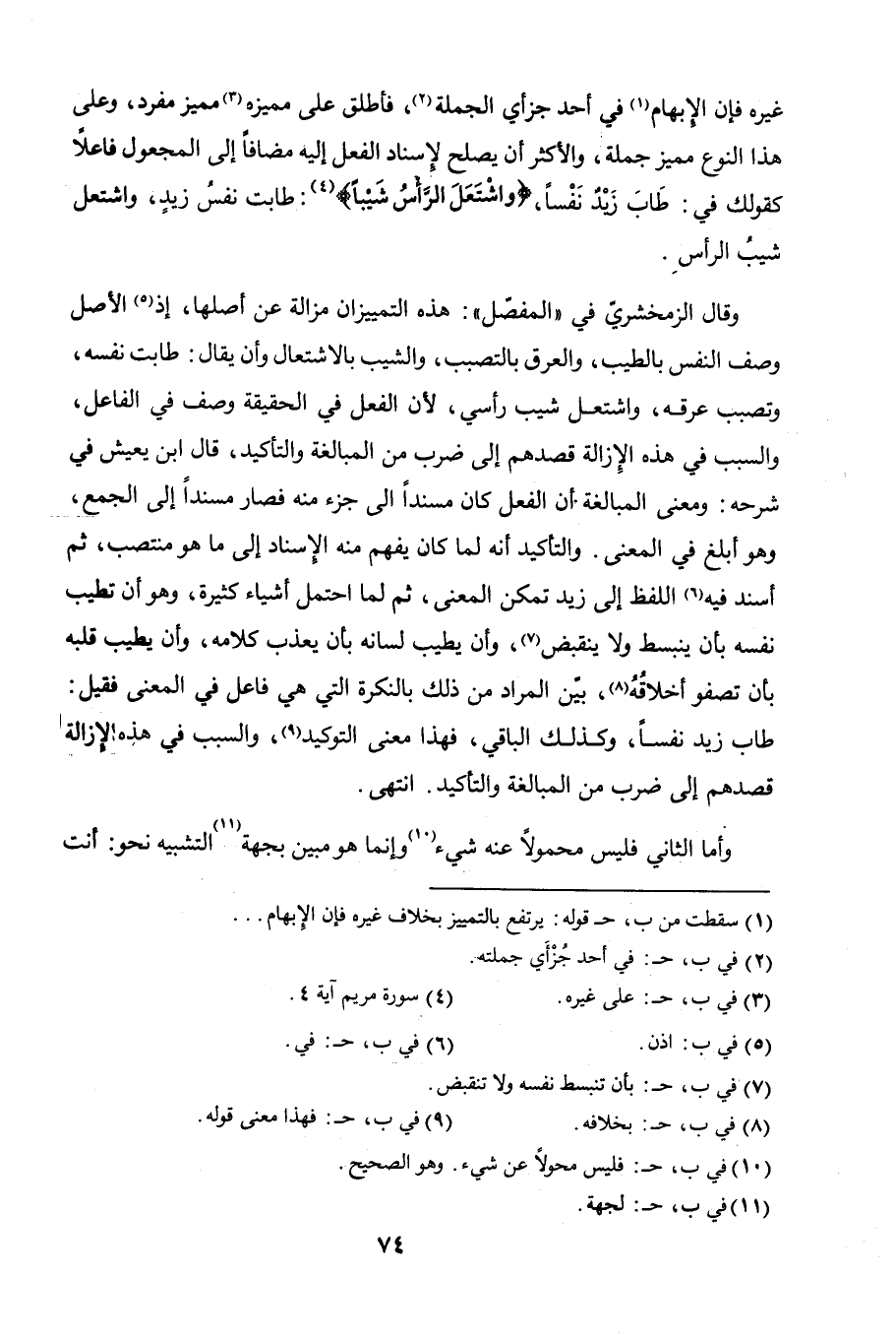 وقال الزمخشري في المفصّل: هذه التمييزات مزالة عن أصلها، إذ الأصل وصف النفس بالطّيب، والعرق بالتصبب، والشيب بالاشتعال، وأن يقال: طابت نفسُه، وتصبب عرقهُ، واشتعل شيبُ رأسي، لأن الفعل في الحقيقة وصف في الفاعل. والسبب في هذه الإزالة قصدهم إلى ضرب من المبالغة والتأكيد.