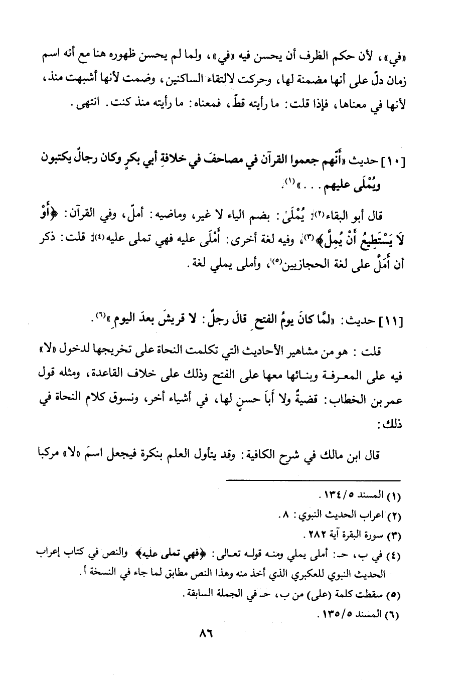 10 - حديث: "أنهم جمعوا القرآن في مصاحف في خلافة أبي بكر، وكان رجال يكتبون، وُيمِلُّ عليهم .. ".