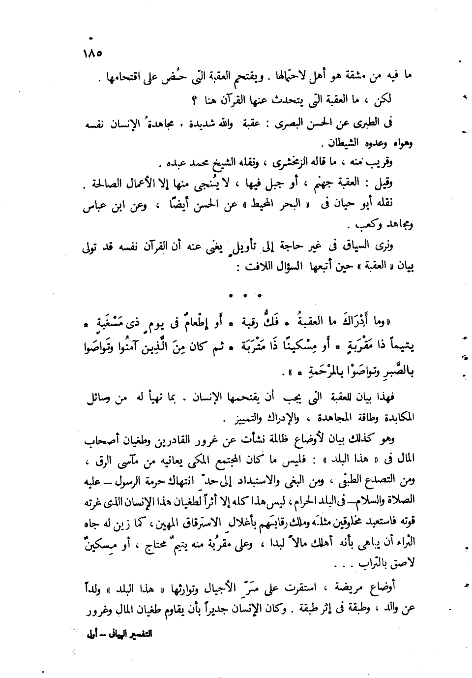 ونرى السياق في غير حاجة إلى تأويل يغنى عنه أن القرآن نفسه قد تول بيان "العقبة" حين أتبعها السؤال اللافت.