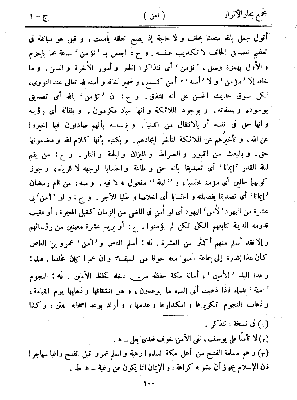 أقول جعل بالله متعلقاً بحلف ولا حاجة إذا يصح تعلقه بأمنت، وقيل هو مبالغة في تعظيم تصديق الحالف لا تكذيب عينيه. وح: اجلس بنا "نؤمن" ساعة هما بالجزم والأول بهمزة وصل، "نؤمن" أي نتذاكر الخير وأمور الآخرة والدين. وما خافه إلا "مؤمن" ولا "أمنه" أمن كسمع، وضمير خافه وأمنه لله تعالى عند النووي، لكن سوق حديث الحسن على أنه للنفاق. وح: أن "تؤمن" بالله أي تصديق بوجوده وبصفاته. وبوجود الملائكة وأنها عباد مكرمون. وبلقائه أي رؤيته وأنها حق في نفسه أو بالانتقال من الدنيا. وبرسله بأنهم صادقون فيما أخبروا عن الله، وتأخيرهم عن الملائكة لتأخر إيجادهم. وبكتبه بأنها كلام الله ومضمونها حق. وبالبعث من القبور والصراط والميزان والجنة والنار. وح: من يقم ليلة القدر "إيماناً" أي تصديقاً بأنه حق وطاعة واحتساباً لوجهه لا للرياء، وجوز كونهما حالين أي مؤمناً محتسباً، و"ليلة" مفعول به لا فيه. ومنه: من قام رمضان "إيماناً" أي تصديقاً بفضيلته واحتساباً أي إخلاصاً وطلباً للأجر. وح: ولو "أمن" بي عشرة من اليهود "لأمن" اليهود أي لو أمن في الماضي من الزمان كقبل الهجرة، أو عقيب قدومه المدينة لتابعهم الكل لكن لم يؤمنوا. ح: أو يريد عشرة معينين من رؤسائهم وإلا فقد أسلم منهم أكثر من العشرة. نه: أسلم الناس و"أمن" عمرو بن العاص كأن هذا إشارة إلى جماعة أمنوا معه خوفاً من السيف وأن عمراً كان مخلصاً. مد: وهذا البلد "الأمين"، أمانة مكة حفظه من دخله كحفظ الأمين. نه: النجوم "أمنة" للسماء فإذا ذهبت أتى السماء ما يوعدون، وهو انشقاقها وذهابها يوم القيامة، وذهاب النجوم تكويرها وانكدارها وعدمها، وأراد بوعد أصحابه الفتن، وكذا