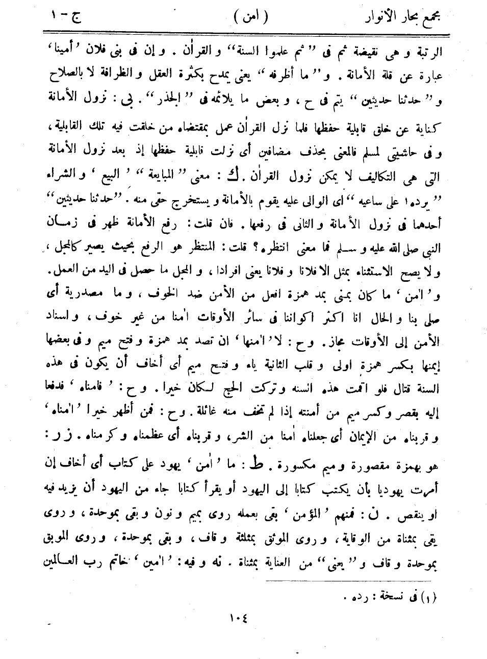 الرتبة وهي نقيضة ثم في "ثم علموا السنة" والقرآن. وإن في بني فلان "أميناً" عبارة عن قلة الأمانة. و"ما أظرفه" يعني يمدح بكثرة العقل والظرافة لا بالصلاح و"حدثنا حديثين" يتم في ح، وبعض ما يلائمه في "الجذر". بي: نزول الأمانة كناية عن خلق قابلية حفظها فلما نزل القرآن عمل بمقتضاه من خلقت فيه تلك القابلية، وفي حاشيتي لمسلم فالمعنى بحذف مضافين أي نزلت قابلية حفظها إذ بعد نزول الأمانة التي هي التكاليف لا يمكن نزول القرآن. ك: معنى "المبايعة" "البيع" والشراء "يرده على ساعيه" أي الوالي عليه يقوم بالأمانة ويستخرج حقي منه. "حدثنا حديثين" أحدهما في نزول الأمانة والثاني في رفعها. فإن قلت: رفع الأمانة ظهر في زمان النبي صلى الله عليه وسلم فما معنى انتظره؟ قلت: المنتظر هو الرفع بحيث يصير كالمجل، ولا يصح الاستثناء بمثل إلا فلاناً وفلاناً يعني أفراداً، والمجل ما حصل في اليد من العمل. و"أمن" ما كان بمنى بمد همزة أفعل من الأمن ضد الخوف، وما مصدرية أي صلى بنا والحال أنا أكثر أكواننا في سائر الأوقات أمناً من غير خوف، وإسناد الأمن إلى الأوقات مجاز. وح: لا "أمنها" أن تصد بمد همزة وفتح ميم وفي بعضها إيمنها بكسر همزة أولى وقلب الثانية ياء وفتح ميم أي أخاف أن يكون في هذه السنة قتال فلو أقمت هذه السنة وتركت الحج لكان خيراً. وح: "فأمناه" فدفعا إليه بقصر وكسر ميم من أمنته إذا لم تخف منه غائلة. وح: فمن أظهر خيراً "أمناه" وقربناه من الإيمان أي جعلناه أمناً من الشر، وقربناه أي عظمناه وكرمناه. ز ر: هو بهمزة مقصورة وميم مكسورة. ط: ما "أمن" يهود على كتاب أي أخاف إن أمرت يهودياً بأن يكتب كتاباً إلى اليهود أو يقرأ كتاباً جاء من اليهود أن يزيد فيه أو ينقص. ن: فمنهم "المؤمن" بقي بعمله روى بميم ونون وبقي بموحدة، وروى يقي بمثناة من الوقاية، وروى الموثق بمثلثة وقاف، وبقي بموحدة، وروى الموبق بموحدة وقاف و"يعني" من العناية بمثناة. نه وفيه: "أمين" خاتم رب العالمين