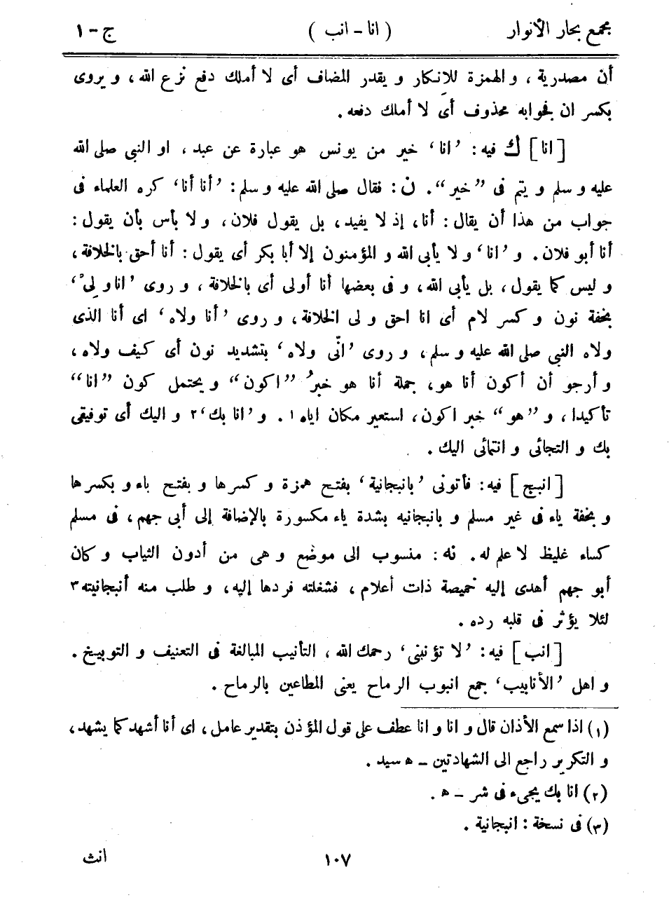 [أنا] ك فيه: "أنا" خير من يونس هو عبارة عن عبد، أو النبي صلى الله عليه وسلم ويتم في "خير". ن: فقال صلى الله عليه وسلم: "أنا أنا" كره العلماء في جواب من هذا أن يقال: أنا، إذ لا يفيد، بل يقول فلان، ولا بأس بأن يقول: أنا أبو فلان. و"أنا" ولا يأبى الله والمؤمنون إلا أبا بكر أي يقول: أنا أحق بالخلافة، وليس كما يقول، بل يأبى الله، وفي بعضها أنا أولى أي بالخلافة، وروى "أنا ولي" بخفة نون وكسر لام أي أنا أحق ولي الخلافة، وروى "أنا ولاه" أي أنا الذي ولاه النبي صلى الله عليه وسلم، وروى "أني ولاه" بتشديد نون أي كيف ولاه، وأرجو أن أكون أنا هو، جملة أنا هو خبر "أكون" ويحتمل كون "أنا" تأكيداً، و"هو" خبر أكون، أستعير مكان إياه. و"أنا بك" وإليك أي توفيقي بك والتجائي وانتمائي إليك.