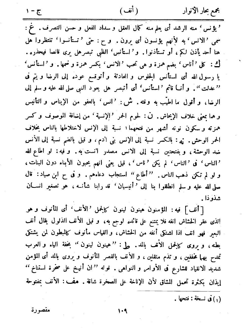 "يؤنس" منه الرشد أي يعلم منه كمال العقل وسداد الفعل وحسن التصرف. غ: سمي "الإنس" به لأنهم يؤنسون أي يرون. وح: "تستأنسوا" تنتظروا هل هنا أحد يأذن لكم، أو تستأذنوا. و"استأنس" الظبي تبصر هل يرى قانصاً فيحذره. ك: كل "أناس" بضم همزة وهي تحب "الإنس" بكسر همزة وضمها. و"استأنس" يا رسول الله أي استأنس الجلوس والمحادثة وأتوقع عوده إلى الرضا ويتم في "عدلت". وأنا قائم "استأنس" أي أتبصر هل يعود النبي صلى الله عليه وسلم إلى الرضا، وأقول ما أطيب به وقته. ش: "أنس" بالعفو من الإيناس والتأنيس وهما بمعنى خلاف الإيحاش. ن: لحوم الحمر "الإنسية" من إضافة الموصوف وكسر همزته وسكون نونه أشهر من فتحهما نسبة إلى الإنس لاختلاطها بالناس بخلاف الحمر الوحش. نه: بالكسر نسبة إلى الإنس بني آدم، وقيل بالضم نسبة إلى الأنس ضد الوحشة، وبفتحتين نسبة إلى الأنس مصدر آنست به. وفيه: لو أطاع الله "الناس" في "الناس" لم يكن "ناس"، قيل يعني أنهم يحبون الأبناء دون البنات، ولو لم تكن ذهب الناس. "أطاع" استجاب دعاءهم. وفي ح ابن صياد: قال صلى الله عليه وسلم انطلقوا بنا إلى "أنيسيان" قد رابنا شأنه، هو تصغير إنسان شذوذاً.