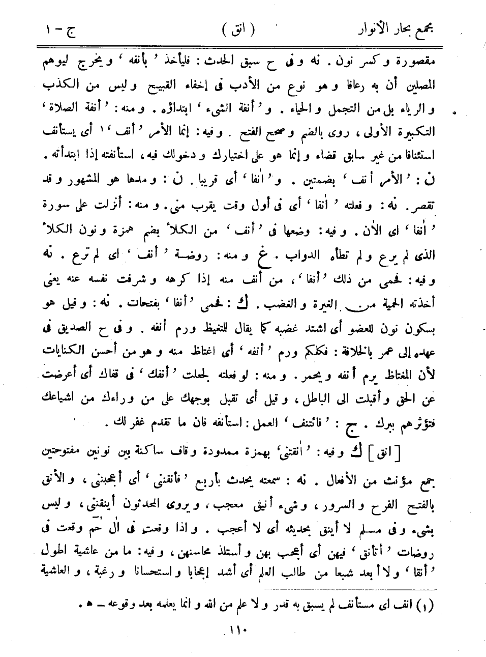 مقصورة وكسر نون. نه وفي ح سبق الحدث: فليأخذ "بأنفه" ويخرج ليوهم المصلين أن به رعافاً وهو نوع من الأدب في إخفاء القبيح وليس من الكذب والرياء بل من التجمل والحياء. و"أنفه الشيء" ابتدأوه. ومنه: "أنفة الصلاة" التكبيرة الأولى، روى بالضم وصحح الفتح. وفيه: إنما الأمر "أنف" أي يستأنف استئنافاً من غير سابق قضاء وإنما هو على اختيارك ودخولك فيه، استأنفته إذا ابتدأته. ن: "الأمر أنف" بضمتين. و"أنفا" أي قريباً. ن: ومدها هو المشهور وقد تقصر. نه: وفعلته "أنفا" أي في أول وقت يقرب مني. ومنه: أنزلت على سورة "أنفا" أي الآن. وفيه: وضعها في "أنف" من الكلأ بضم همزة ونون الكلأ الذي لم يرع ولم تطأه الدواب. غ ومنه: روضة "أنف" أي لم ترع. نه وفيه: فحمى من ذلك "أنفا"، من أنف منه إذا كرهه وشرفت نفسه عنه يعني أخذته الحمية من الغيرة والغضب. ك: فحمى "أنفا" بفتحات. نه: وقيل هو بسكون نون للعضو أي اشتد غضبه كما يقال للمتغيظ ورم أنفه. وفي ح الصديق في عهده إلى عمر بالخلافة: فكلكم ورم "أنفه" أي اغتاظ منه وهو من أحسن الكنايات لأن المغتاظ يرم أنفه ويحمر. ومنه: لو فعلته لجعلت "أنفك" في قفاك أي أعرضت عن الحق وأقبلت إلى الباطل، وقيل أي تقبل بوجهك على من وراءك من أشياعك فتؤثرهم ببرك. ج: "فائتنف" العمل: استأنفه فإن ما تقدم غفر لك.