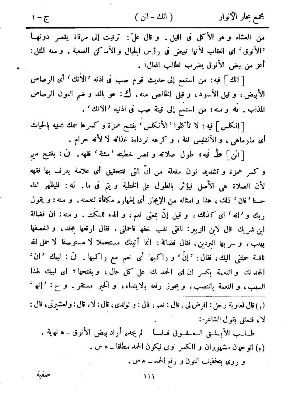 [انكلس] فيه: لا تأكلوا "الأنكلس" بفتح همزة وكسرها سمك شبيه بالحيات أي مارماهي، والأنقليس لغة، وكرهه لرداءة غذائه لا لأنه حرام.