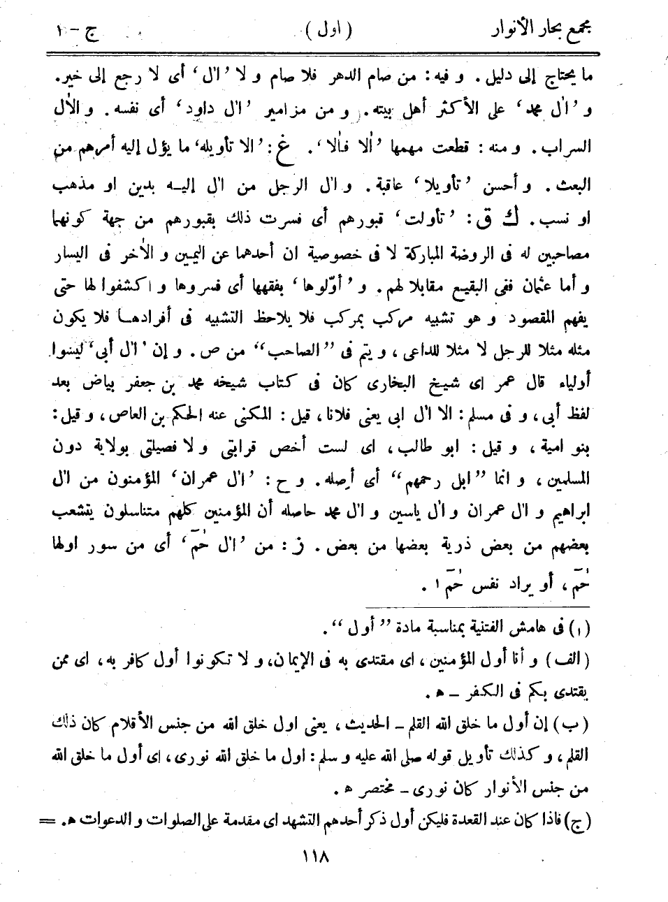 ما يحتاج إلى دليل. وفيه: من صام الدهر فلا صام ولا "أل" أي لا رجع إلى خيره و"آل محمد" على الأكثر أهل بيته. ومن مزامير "آل داود" أي نفسه. والأل السراب. ومنه: قطعت مهمها "إلا فألا". غ: "ألا تأويله" ما يؤول إليه أمرهم من البعث. وأحسن "تأويلا" عاقبة. وآل الرجل من آل إليه بدين أو مذهب أو نسب. ك ق: "تأولت" قبورهم أي فسرت ذلك بقبورهم من جهة كونهما مصاحبين له في الروضة المباركة لا في خصوصية أن أحدهما عن اليمين والآخر في اليسار وأما عثمان ففي البقيع مقابلاً لهم. و"أولوها" بفقهها أي فسروها وأكشفوا لها حتى يفهم المقصود وهو تشبيه مركب بمركب فلا يلاحظ التشبيه في أفرادها فلا يكون مثله مثلاً للرجل لا مثلاً للداعي، ويتم في "الصاحب" من ص. وإن "آل أبي" ليسوا أولياء قال عمر أي شيخ البخاري كان في كتاب شيخه محمد بن جعفر بياض بعد لفظ أبي، وفي مسلم: إلا آل أبي يعني فلاناً، قيل: المكني عنه الحكم بن العاص، وقيل: بنو أمية، وقيل: أبو طالب، أي لست أخص قرابتي ولا فصيلتي بولاية دون المسلمين، وإنما "أبل رحمهم" أي أصله. وح: "آل عمران" المؤمنون من آل إبراهيم وآل عمران وآل ياسين وآل محمد حاصله أن المؤمنين كلهم متناسلون يتشعب بعضهم من بعض ذرية بعضها من بعض. ز: من "آل حم" أي من سور أولها حم، أو يراد نفس حم.
