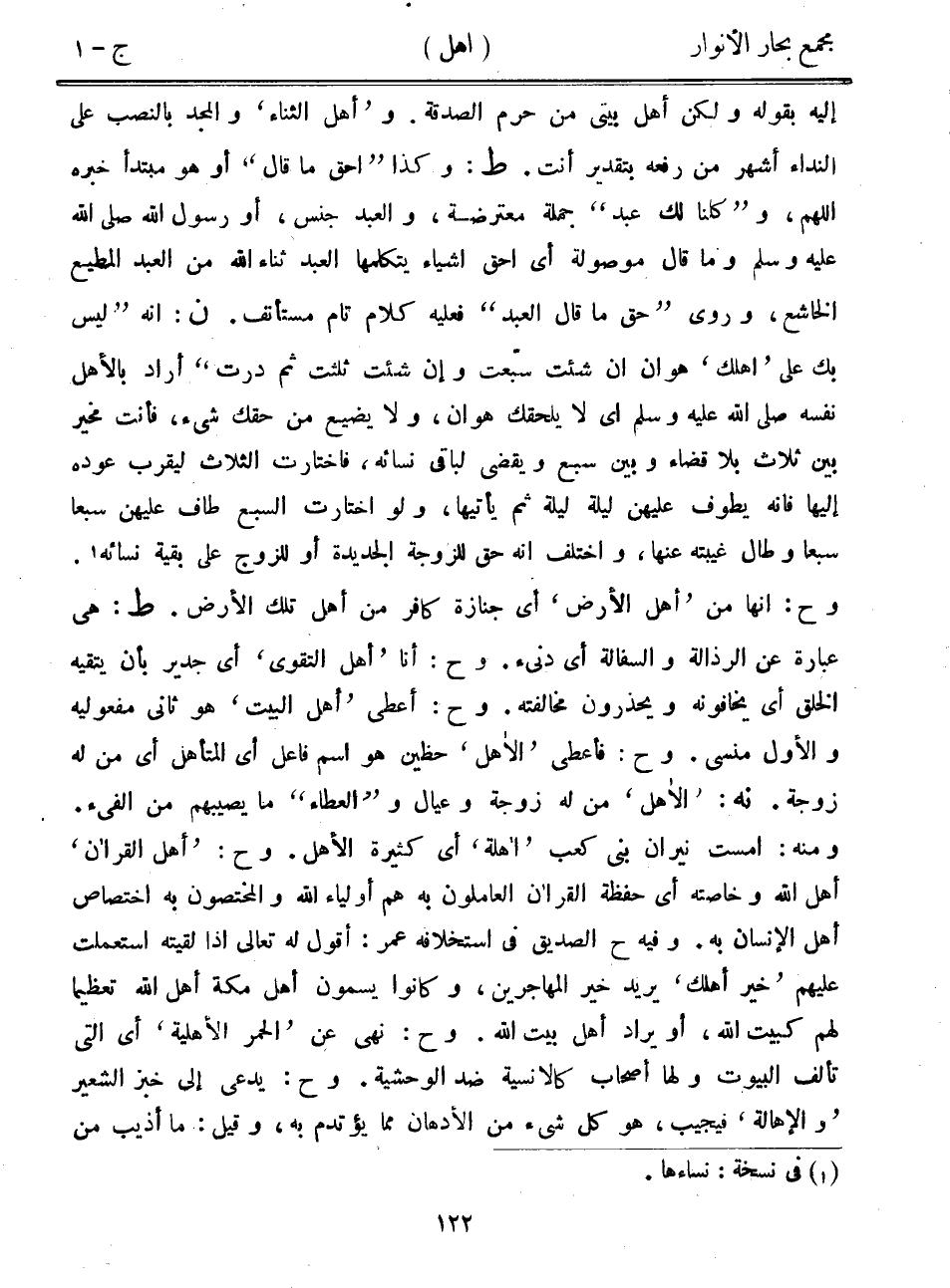 إليه بقوله ولكن أهل بيتي من حرم الصدقة. و"أهل الثناء" والمجد بالنصب على النداء أشهر من رفعه بتقدير أنت. ط: وكذا "أحق ما قال" أو هو مبتدأ خبره اللهم، و"كلنا لك عبد" جملة معترضة، والعبد جنس، أو رسول الله صلى الله عليه وسلم وما قال موصولة أي أحق أشياء يتكلمها العبد ثناء الله من العبد المطيع الخاشع، وروى "حق ما قال العبد" فعليه كلام تام مستأنف. ن: أنه "ليس بك على "أهلك" هوان إن شئت سبعت وإن شئت ثلثت ثم درت، أراد بالأهل نفسه صلى الله عليه وسلم أي لا يلحقك هوان، ولا يضيع من حقك شيء، فأنت مخير بين ثلاث بلا قضاء وبين سبع ويقضي لباقي نسائه، فاختارت الثلاث ليقرب عوده إليها فإنه يطوف عليهن ليلة ليلة ثم يأتيها، ولو اختارت السبع طاف عليهن سبعاً سبعاً وطال غيبته عنها، واختلف أنه حق للزوجة الجديدة أو للزوج على بقية نسائه. وح: أنها من "أهل الأرض" أي جنازة كافر من أهل تلك الأرض. ط: هي عبارة عن الرذالة والسفالة أي دنئ. وح: أنا "أهل التقوى" أي جدير بأن يتقيه الخلق أي يخافونه ويحذرون مخالفته. وح: أعطى "أهل البيت" هو ثاني مفعوليه والأول منسي. وح: فأعطى "الأهل" حظين هو اسم فاعل أي المتأهل أي من له زوجة. نه: الأهل" من له زوجة وعيال و"العطاء"ما يصيبهم من الفيء. ومنه: أمست نيران بني كعب "أهلة" أي كثيرة الأهل. وح: "أهل القرآن" أهل الله وخاصته أي حفظة القرآن العاملون به هم أولياء الله والمختصون به اختصاص أهل الإنسان به. وفيه ح الصديق في استخلافه عمر: أقول له تعالى إذا لقيته استعملت عليهم "خير أهلك" يريد خير المهاجرين، وكانوا يسمون أهل مكة أهل الله تعظيماً لهم كبيت الله، أو يراد أهل بيت الله. وح: نهى عن "الحمر الأهلية" أي التي تألف البيوت ولها أصحاب كالإنسية ضد الوحشية. وح: يدعى إلى خبز الشعير "والإهالة" فيجيب، هو كل شيء من الأدهان مما يؤتدم به، وقيل: ما أذيب من