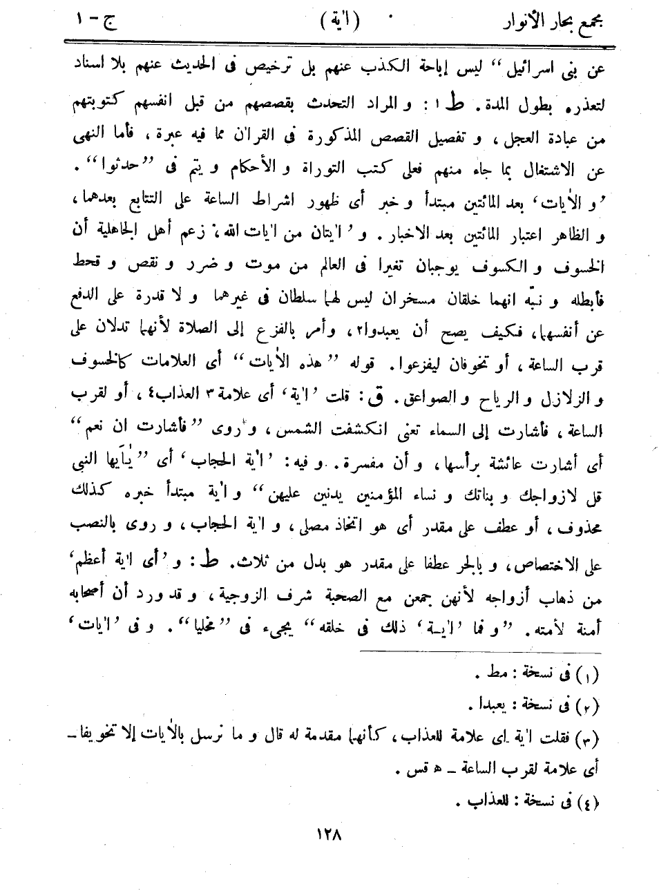 عن بني إسرائيل" ليس إباحة الكذب عنهم بل ترخيص في الحديث عنهم بلا إسناد لتعذره بطول المدة. ط: والمراد التحدث بقصصهم من قبل أنفسهم كتوبتهم من عبادة العجل، وتفصيل القصص المذكورة في القرآن مما فيه عبرة، فأما النهي عن الاشتغال بما جاء منهم فعلى كتب التوراة والأحكام ويتم في "حدثوا". "والآيات" بعد المائتين مبتدأ وخبر أي ظهور إشراط الساعة على التتابع بعدهما، والظاهر اعتبار المائتين بعد الأخبار. و"آيتان من آيات الله" زعم أهل الجاهلية أن الخسوف والكسوف يوجبان تغيراً في العالم من موت وضرر ونقص وقحط فأبطله ونبه أنهما خلقان مسخران ليس لهما سلطان في غيرهما ولا قدرة على الدفع عن أنفسهما، فكيف يصح أن يعبدوا، وأمر بالفزع إلى الصلاة لأنهما تدلان على قرب الساعة، أو تخوفان ليفزعوا. قوله "هذه الآيات" أي العلامات كالخسوف والزلازل والرياح والصواعق. ق: قلت "آية" أي علامة العذاب، أو لقرب الساعة، فأشارت إلى السماء تعني انكشفت الشمس، وروى "فأشارت أن نعم" أي أشارت عائشة برأسها، وأن مفسرة. وفيه: "آية الحجاب" أي "يأيها النبي قل لأزواجك وبناتك ونساء المؤمنين يدنين عليهن" وآية مبتدأ خبره كذلك محذوف، أو عطف على مقدر أي هو اتخاذ مصلى، وآية الحجاب، وروى بالنصب على الاختصاص، وبالجر عطفاً على مقدر هو بدل من ثلاث. ط: و"أي آية أعظم" من ذهاب أزواجه لأنهن جمعن مع الصحبة شرف الزوجية، وقد ورد أن أصحابه أمنة لأمته. "وفما "آية" ذلك في خلقه" يجيء في "مخليا". وفي "آيات"