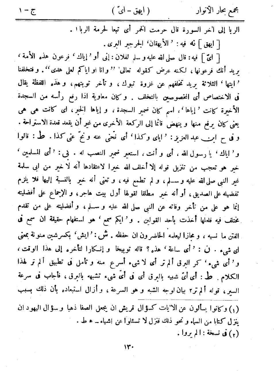 [أي] فيه: قال صلى الله عليه وسلم لفلان: إني أو "إياك" فرعون هذه الأمة" يريد أنك فرعونها، لكنه عرض كقوله تعالى: {وإنا أو إياكم لعلى هدى". وفتخلفنا "أيتها" الثلاثة يريد تخلفهم عن غزوة تبوك، وتأخر توبتهم، وهذه اللفظة يقال في الاختصاص أي المخصوصين بالتخلف. وكان معاوية إذا رفع رأسه من السجدة الأخيرة كانت "إياها"، اسم كان ضمير السجدة، وإياها الخبر، أي كانت هي هي يعني كان يرفع منها وينهض قائماً إلى الركعة الأخرى من غير أن يقعد قعدة الاستراحة. وفي ح ابن عبد العزيز: "إياي وكذا" أي نحني عنه ونح عني كذا. ط: قالوا و"إياك" يا رسول الله، أي وأنت، استعير ضمير النصب له. بي: "أي المسلمين" خير هو تعجب من تنزيل قوله إلا أخلف الله خيراً لاعتقادها أنه لا خير من أبي سلمة غير النبي صلى الله عليه وسلم، ولم تطمع فيه، وتعني أنه خير بالنسبة إليها فلا يلزم تفضيله على الصديق، أو أنه خير مطلقاً لقولها أول بيت هاجر، والإجماع على أفضليته إنما هو على من تأخر وفاته عن النبي صلى الله عليه وسلم، وأفضليته على من تقدم مختلف فيه فلعلها أخذت بأحد القولين. و"أيكم سمع" هو استفهام حقيقة أن سمع في الفتن ما نسيه، ومجازاً ليعلمه الحاضرون أن حفظه. ش: "إيش" بكسر شين منونة بمعنى أي شيء. ن: "أي ساعة" هذه؟ قاله توبيخاً وإنكاراً لتأخره إلى هذا الوقت، و"أي شيء" كمر البرق ألم تر أي لا شيء أسرع منه وتأمل في تطبيق ألم تر لهذا الكلام. ط: أي أي شبيه بالبرق أي في أي شيء تشبهه بالبرق، فأجاب في سرعة السير، قوله ألم تر بيان لوجه الشبه وهو السرعة، وأزال استبعاده بأن ذلك بسبب