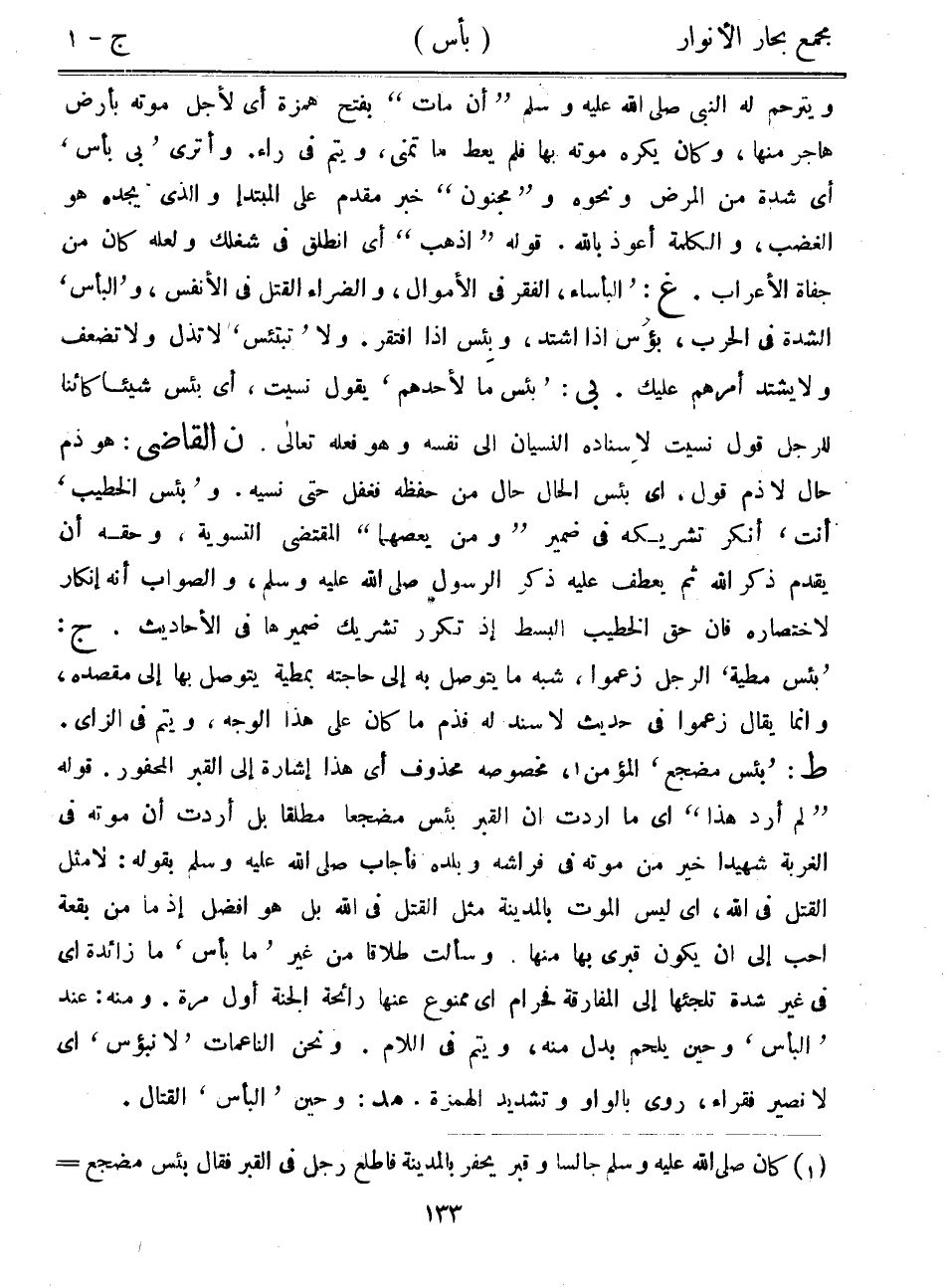 ويترحم له النبي صلى الله عليه وسلم "أن مات" بفتح همزة أي لأجل موته بأرض هاجر منها، وكان يكره موته بها فلم يعط ما تمنى، ويتم في راء. وأترى "بي بأس" أي شدة من المرض ونحوه و"مجنون" خبر مقدم على المبتدأ والذي يجده هو الغضب، والكلمة أعوذ بالله. قوله "اذهب" أي انطلق في شغلك ولعله كان من جفاة الأعراب. غ: "البأساء، الفقر في الأموال، والضراء القتل في الأنفس، و"البأس" الشدة في الحرب، بؤس إذا اشتد، وبئس إذا افتقر. ولا "تبتئس" لا تذل ولا تضعف ولا يشتد أمرهم عليك. بي: "بئس ما لأحدهم" يقول نسيت، أي بئس شيئاً كائناً للرجل قول نسيت لإسناده النسيان إلى نفسه وهو فعله تعالى. ن القاضي: هو ذم حال لا ذم قول، أي بئس الحال حال من حفظه فغفل حتى نسيه. و"بئس الخطيب" أنت، أنكر تشريكه في ضمير "ومن يعصهما" المقتضي التسوية، وحقه أن يقدم ذكر الله ثم يعطف عليه ذكر الرسول صلى الله عليه وسلم، والصواب أنه إنكار لاختصاره فإن حق الخطيب البسط إذ تكرر تشريك ضميرها في الأحاديث. ج: "بئس مطية" الرجل زعموا، شبه ما يتوصل به إلى حاجته بمطية يتوصل بها إلى مقصده، وإنما يقال زعموا في حديث لا سند له فذم ما كان على هذا الوجه، ويتم في الزاي. ط: "بئس مضجع" المؤمن، مخصوصه محذوف أي هذا إشارة إلى القبر المحفور. قوله "لم أرد هذا" أي ما أردت أن القبر بئس مضجعاً مطلقاً بل أردت أن موته في الغربة شهيداً خير من موته في فراشه وبلده فأجاب صلى الله عليه وسلم بقوله: لا مثل القتل في الله، أي ليس الموت بالمدينة مثل القتل في الله بل هو أفضل إذ ما من بقعة أحب إلى أن يكون قبري بها منها. وسألت طلاقاً من غير "ما بأس" ما زائدة أي في غير شدة تلجئها إلى المفارقة فحرام أي ممنوع عنها رائحة الجنة أول مرة. ومنه: عند "البأس" وحين يلحم بدل منه، ويتم في اللام. ونحن الناعمات "لا نبؤس" أي لا نصير فقراء، روى بالواو وتشديد الهمزة. مد: وحين "البأس" القتال.