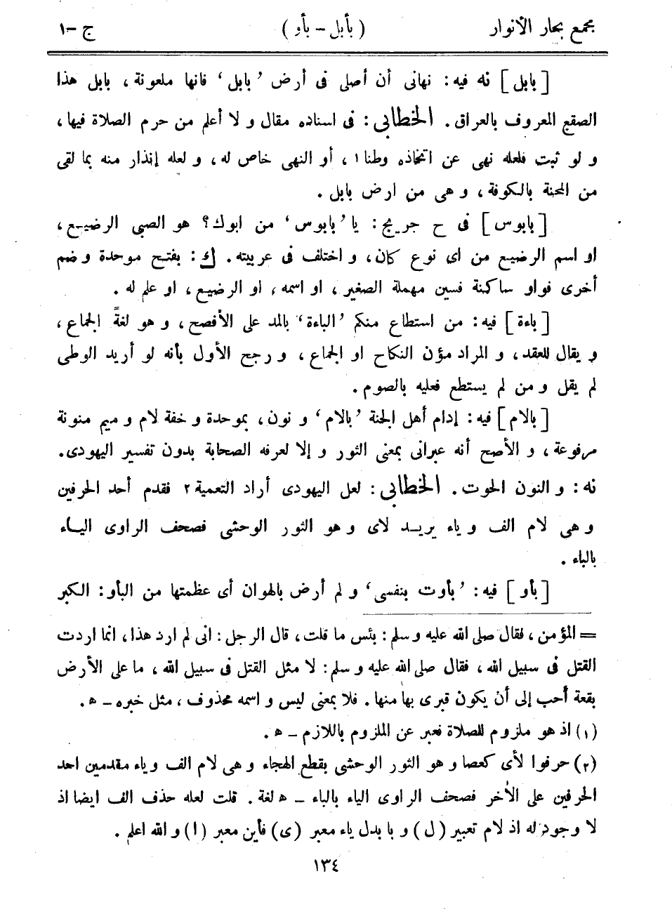 [بابل] نه فيه: نهاني أن أصلي في أرض "بابل" فإنها ملعونة، بابل هذا الصقع المعروف بالعراق. الخطابي: في إسناده مقال ولا أعلم من حرم الصلاة فيها، ولو ثبت فلعله نهى عن اتخاذه وطناً، أو النهي خاص له، ولعله إنذار منه بما لقى من المحنة بالكوفة، وهي من أرض بابل.