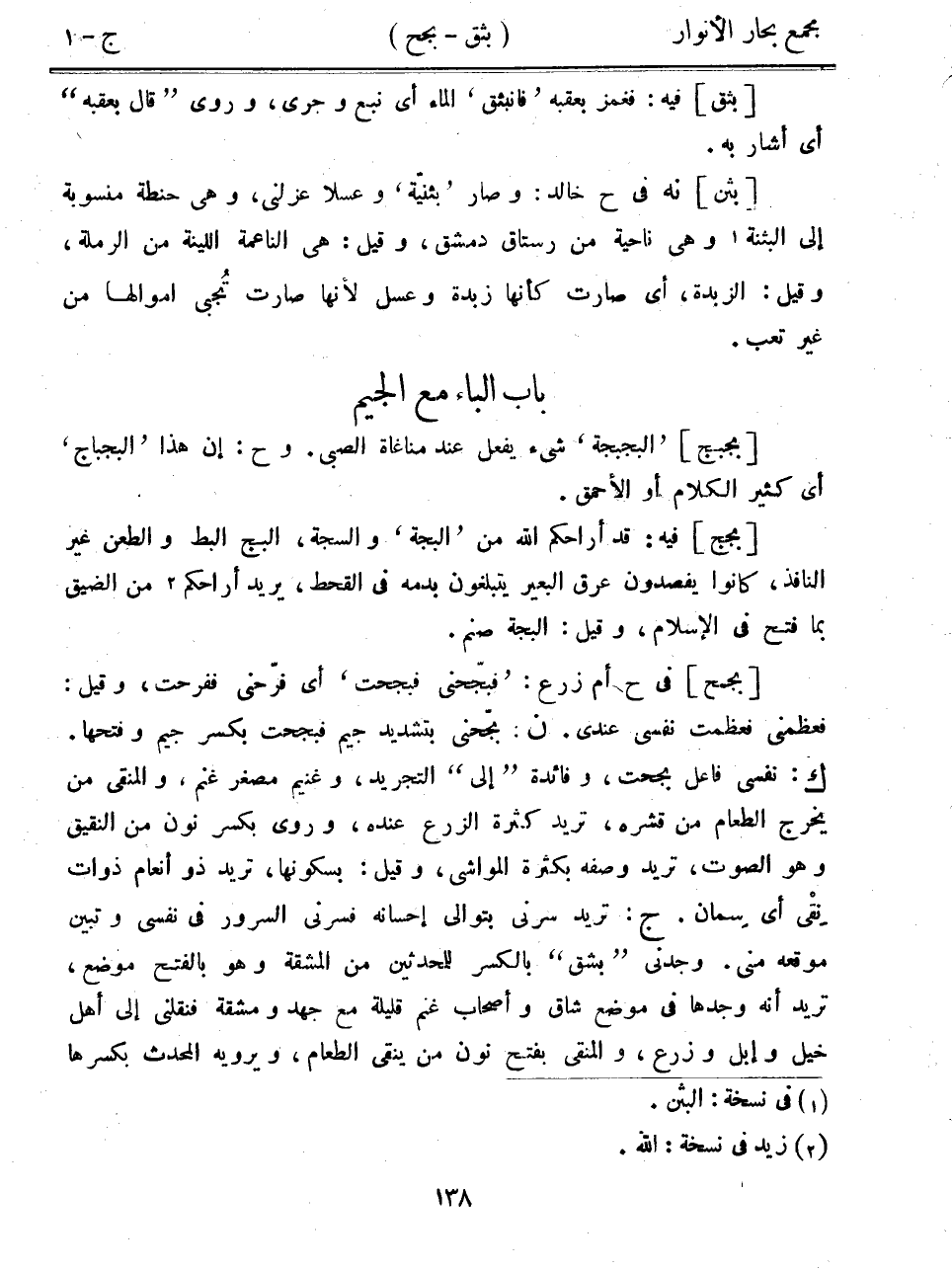 [بجمح] في ح أم زرع: "فبجحني فبجحت" أي فرحني ففرحت، وقيل: فعظمني فعظمت نفسي عندي. ن: بجحني بتشديد جيم فبجحت بكسر جيم وفتحها. ك: نفسي فاعل بجحت، وفائدة "إلى" التجريد، وغنيم مصغر غنم، والمنقى من يخرج الطعام من قشره، تريد كثرة الزرع عنده، وروى بكسر نون من النقيق وهو الصوت، تريد وصفه بكثرة المواشي، وقيل: بسكونها، تريد ذو أنعام ذوات نقي أي سمان. ج: تريد سرني بتوالي إحسانه فسرني السرور في نفسي وتبين موقعه مني. وجدني "بشق" بالكسر للمحدثين من المشقة وهو بالفتح موضع، تريد أنه وجدها في موضع شاق وأصحاب غنم قليلة مع جهد ومشقة فنقلني إلى أهل خيل وإبل وزرع، والمنقى بفتح نون من ينقي الطعام، ويرويه المحدث بكسرها