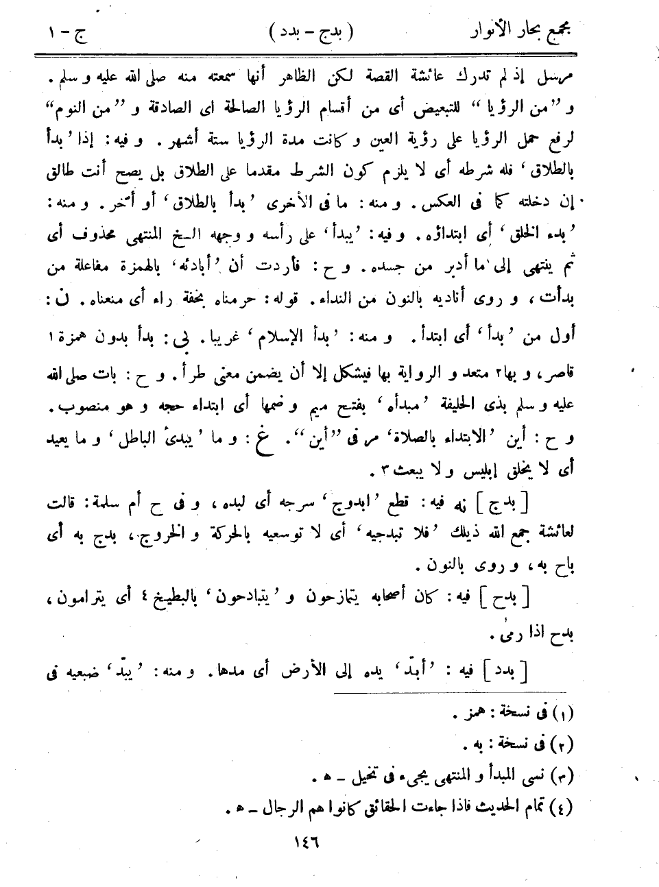 مرسل إذ لم تدرك عائشة القصة لكن الظاهر أنها سمعته منه صلى الله عليه وسلم. و"من الرؤيا" للتبعيض أي من أقسام الرؤيا الصالحة أي الصادقة و"من النوم" لرفع حمل الرؤيا على رؤية العين وكانت مدة الرؤيا ستة أشهر. وفيه: إذا "بدأ بالطلاق" فله شرطه أي لا يلزم كون الشرط مقدماً على الطلاق بل يصح أنت طالق إن دخلته كما في العكس. ومنه: ما في الأخرى "بدأ بالطلاق" أو أخر. ومنه: "بدء الخلق" أي ابتداؤه. وفيه: "يبدأ" على رأسه ووجهه إلخ المنتهي محذوف أي ثم ينتهي إلى ما أدبر من جسده. وح: فأردت أن "أبادئه" بالهمزة مفاعلة من بدأت، وروى أناديه بالنون من النداء. قوله: حرمناه بخفة راء أي منعناه. ن: أول من "بدأ" أي ابتدأ. ومنه: "بدأ الإسلام" غريباً. بي: بدأ بدون همزة قاصر، وبها متعد والرواية بها فيشكل إلا أن يضمن معنى طرأ. وح: بات صلى الله عليه وسلم بذي الحليفة "مبدأه" بفتح ميم وضمها أي ابتداء حجه وهو منصوب. وح: أين "الابتداء بالصلاة" مر في "أين". غ: وما "يبدئ الباطل" وما يعيد أي لا يخلق إبليس ولا يبعث.
