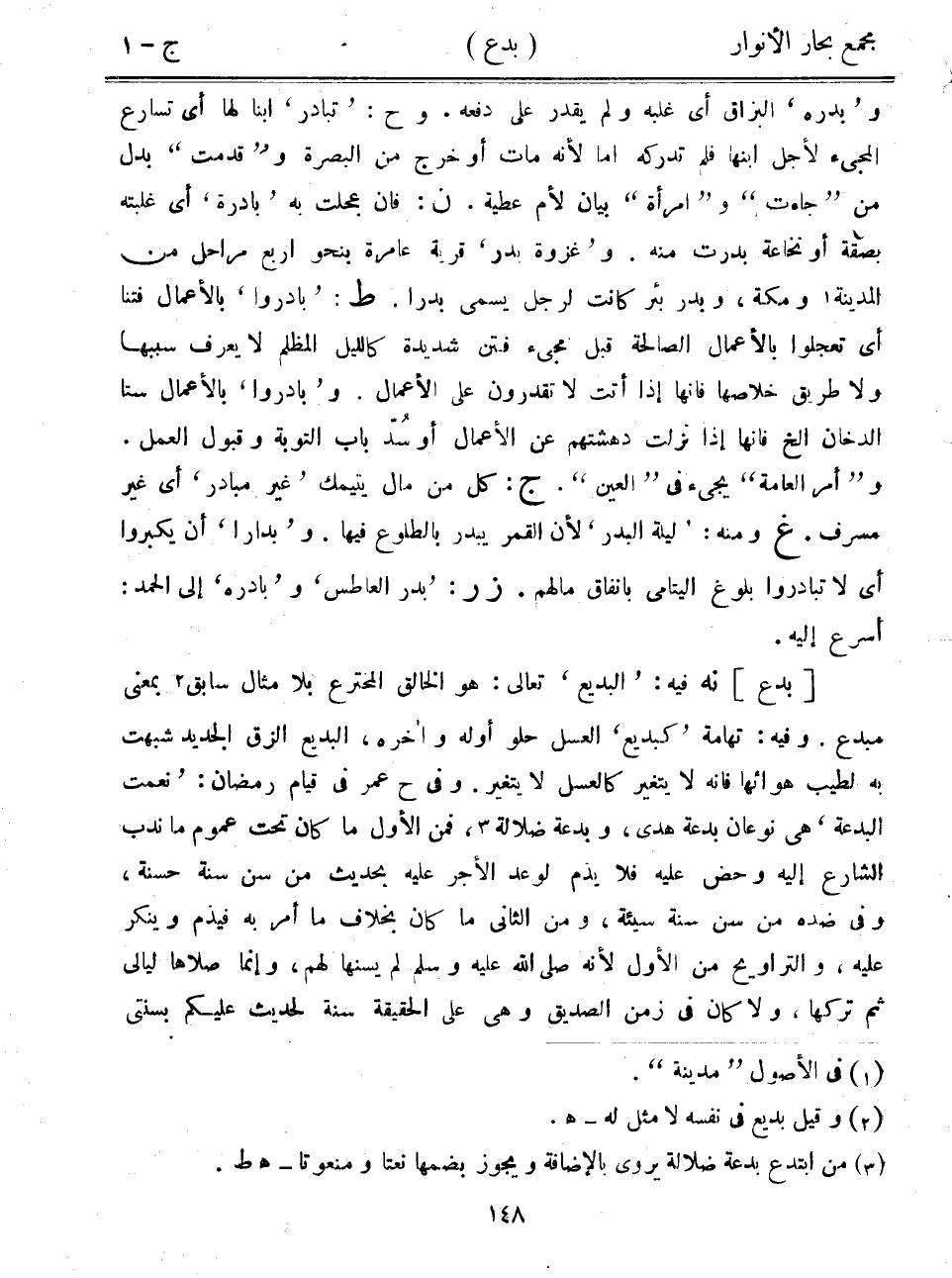 و"بدره" البزاق أي غلبه ولم يقدر على دفعه. وح: "تبادر" ابنا لها أي تسارع المجيء لأجل ابنها فلم تدركه أما لأنه مات أو خرج من البصرة و"قدمت" بدل من "جاءت" و"امرأة" بيان لأم عطية. ن: فإن عجلت به "بادرة" أي غلبته بصفة أو نخاعة بدرت منه. و"غزوة بدر" قرية عامرة بنحو أربع مراحل من المدينة ومكة، وبدر بئر كانت لرجل يسمى بدراً. ط: "بادروا" بالأعمال فتناً أي تعجلوا بالأعمال الصالحة قبل مجيء فتن شديدة كالليل المظلم لا يعرف سببها ولا طريق خلاصها فإنها إذا أتت لا تقدرون على الأعمال. و"بادروا" بالأعمال ستاً الدخان إلخ فإنها إذا نزلت دهشتهم عن الأعمال أو سد باب التوبة وقبول العمل. و"أمر العامة" يجيء في "العين". ج: كل من مال يتيمك "غير مبادر" أي غير مسرف. غ ومنه: "ليلة البدر" لأن القمر يبدر بالطلوع فيها. و"بدارا" أن يكبروا أي لا تبادروا بلوغ اليتامى بإنفاق مالهم. زر: "بدر العاطس" و"بادره" إلى الحمد: أسرع إليه.