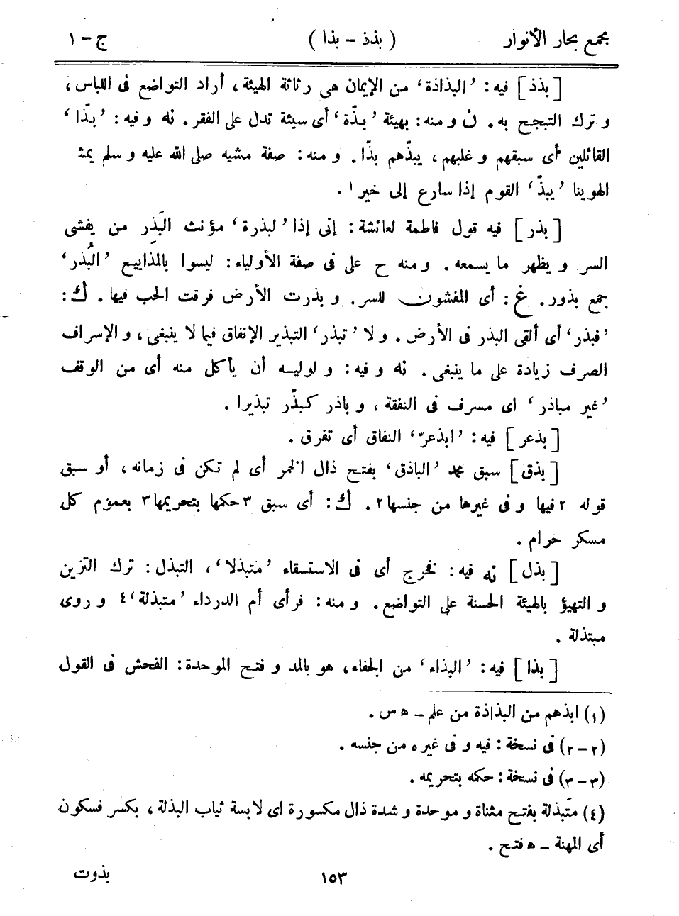 [بذر] فيه قول فاطمة لعائشة: إني إذا "لبذرة" مؤنث البذر من يفشي السر ويظهر ما يسمعه. ومنه ح على في صفة الأولياء: ليسوا بالمذاييع "البذر" جمع بذور. غ: أي المفشون للسر. وبذرت الأرض فرقت الحب فيها. ك: "فبذر" أي ألقى البذر في الأرض. ولا "تبذر" التبذير الإنفاق فيما لا ينبغي، والإسراف الصرف زيادة على ما ينبغي. نه وفيه: ولوليه أن يأكل منه أي من الوقف "غير مباذر" أي مسرف في النفقة، وباذر كبذر تبذيراً.